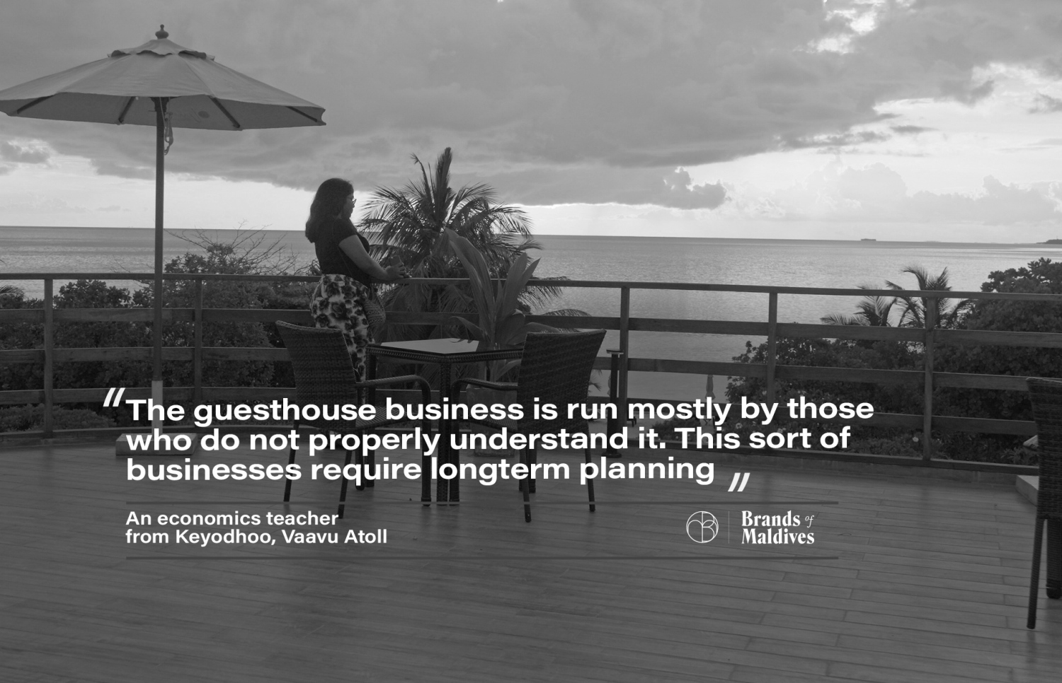 In the words of an economics teacher from Keyodhoo, Vaavu Atoll, as the guesthouse business expands, only a few businesses develop alongside the industry.
