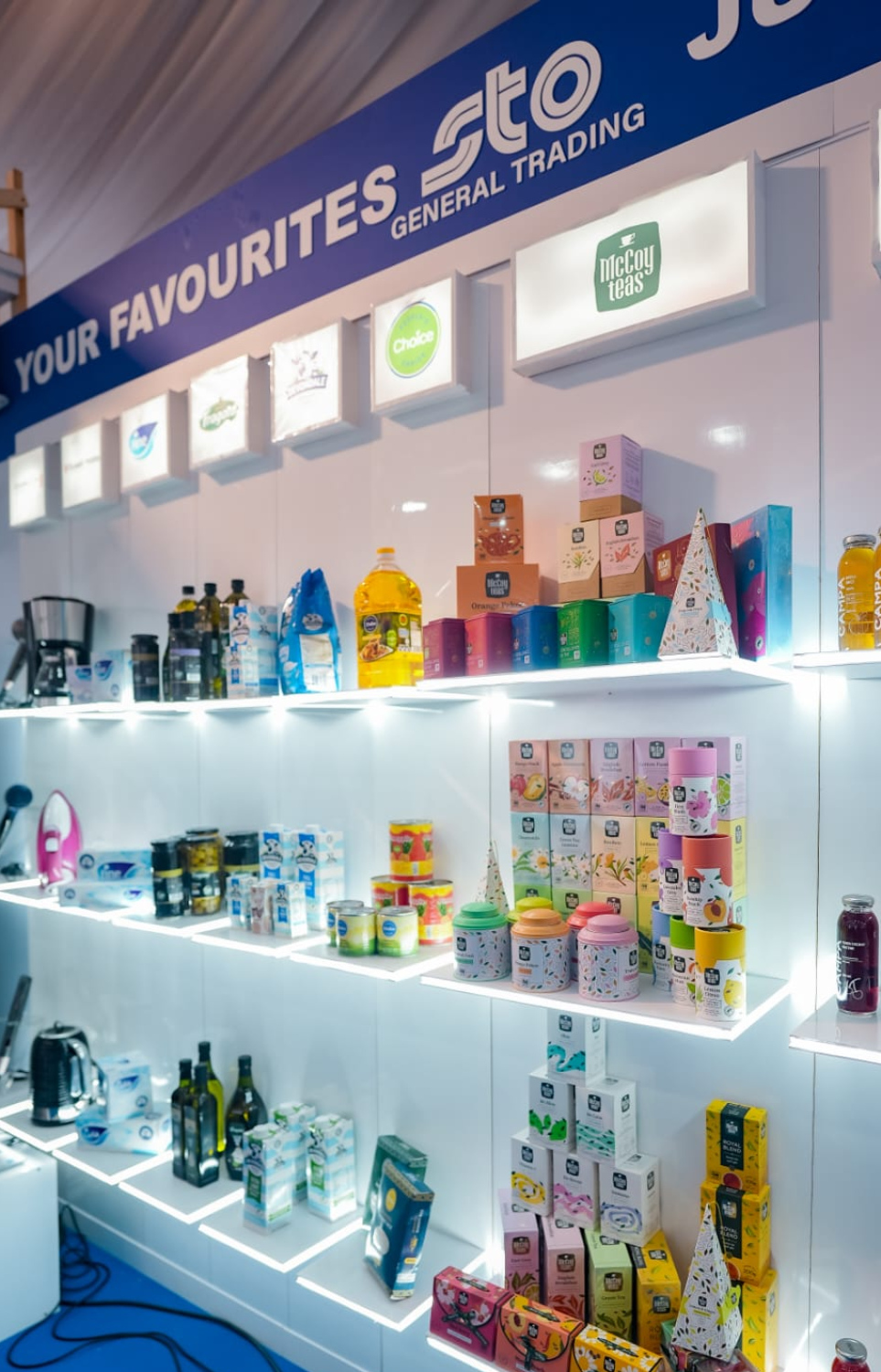 At the STO General Trading stall, products from popular international brands such as Devondale, Remington, Fragata, and Choice are on display for visitors.