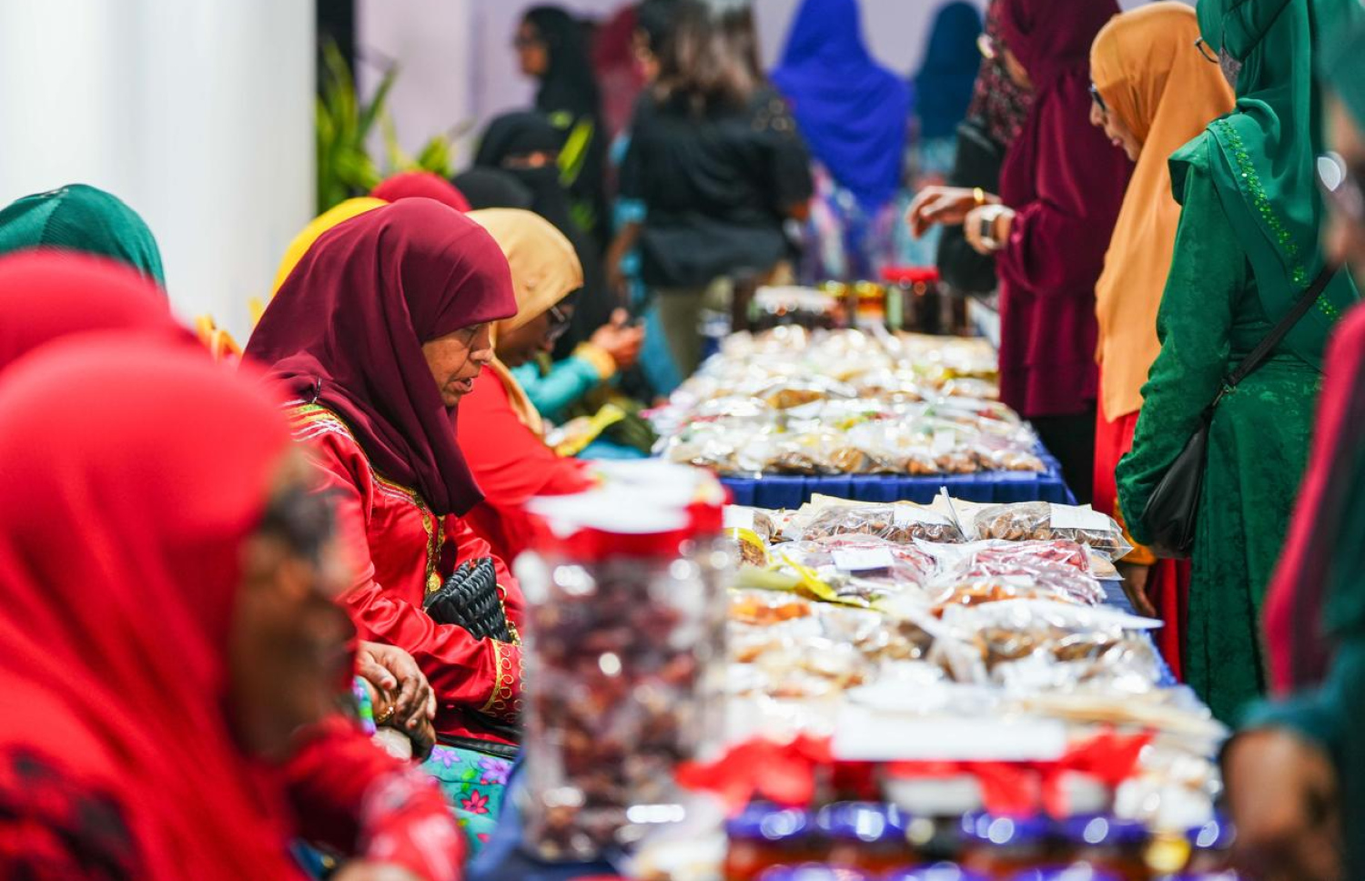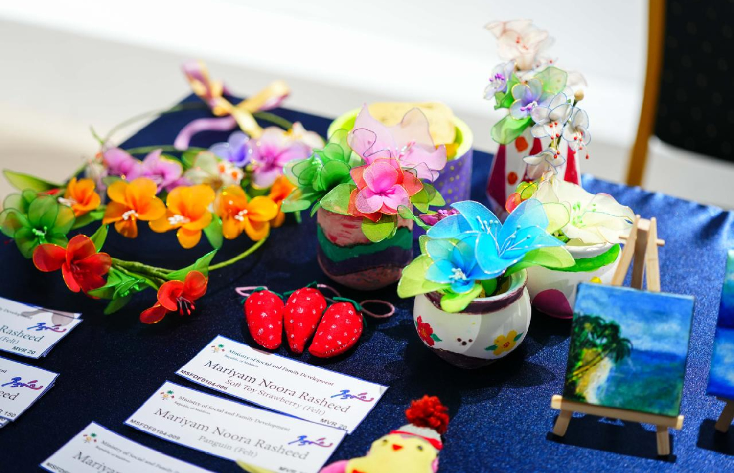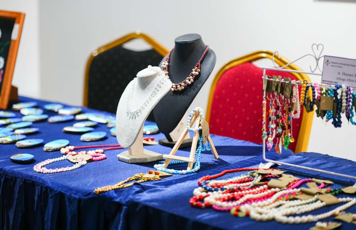 The exhibition features a wide range of artworks and handicrafts, including paintings depicting scenes from the Maldives, Arabic typography, handmade jewelry, and items for home decoration.