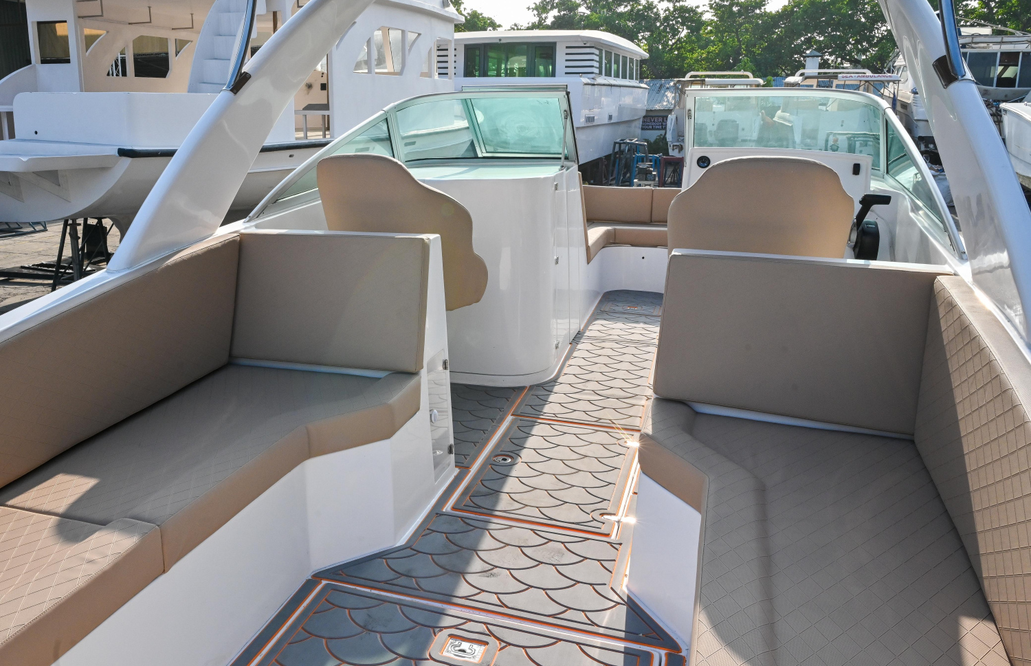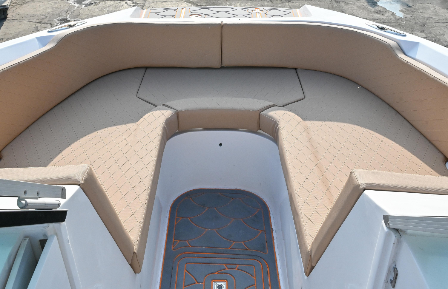 It has leather seats and four day beds for sunbathing, with two being in the front and two being in the back of the speedboat.