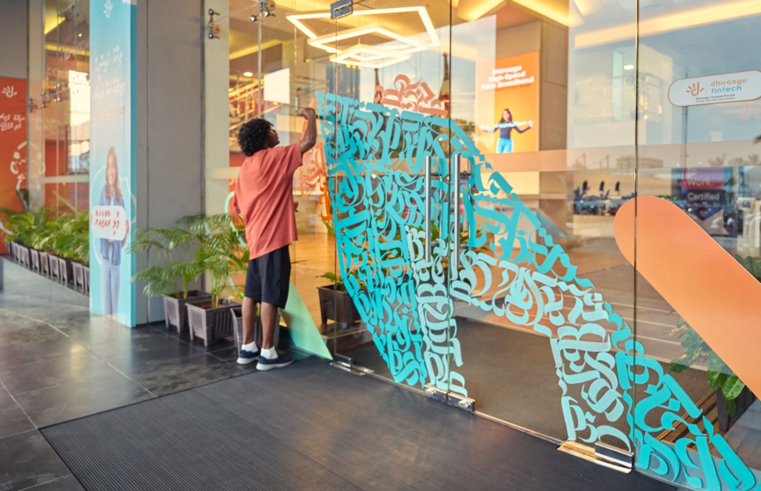 "This mural was created by using calligraphy and infusing it with the raises in Dhiraagu's branding. I developed a concept for this piece. However, this was created on the spot via free hand," said earthling while talking about the mural.