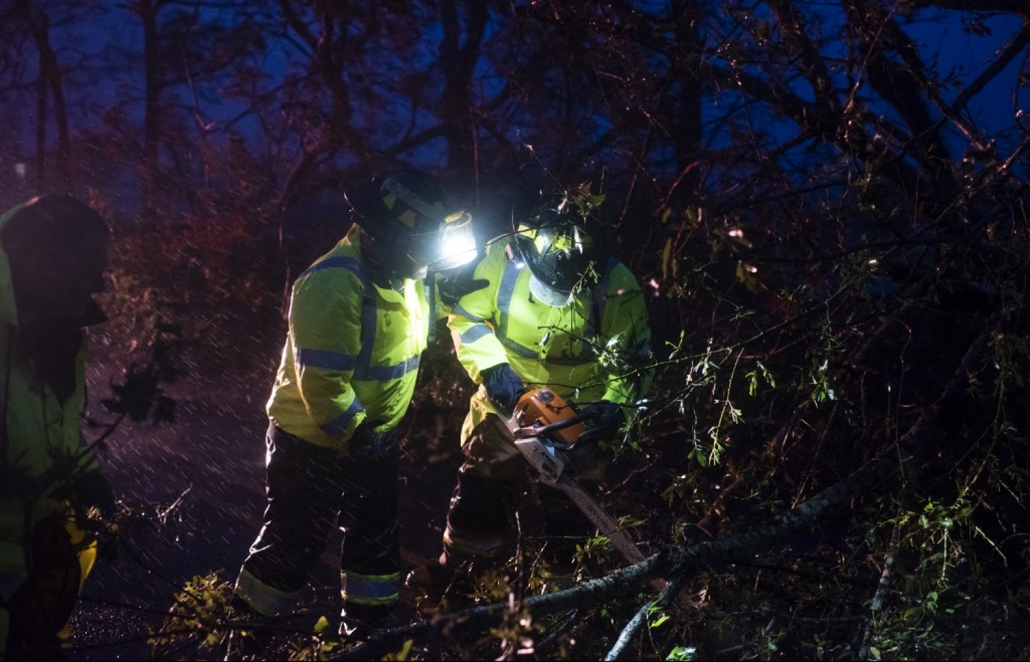 Montegut and Bourg firefighters cut through trees on the road in Bourg, Louisiana as Hurricane Ida passes on August 29, 2021. - Hurricane Ida struck the coast of Louisiana on August 29 as a powerful Category 4 storm, 16 years to the day after deadly Hurricane Katrina devastated the southern US city of New Orleans."Extremely dangerous Category 4 Hurricane Ida makes landfall near Port Fourchon, Louisiana," the National Hurricane Center wrote in an advisory -- Photo: Mark Felix / AFP