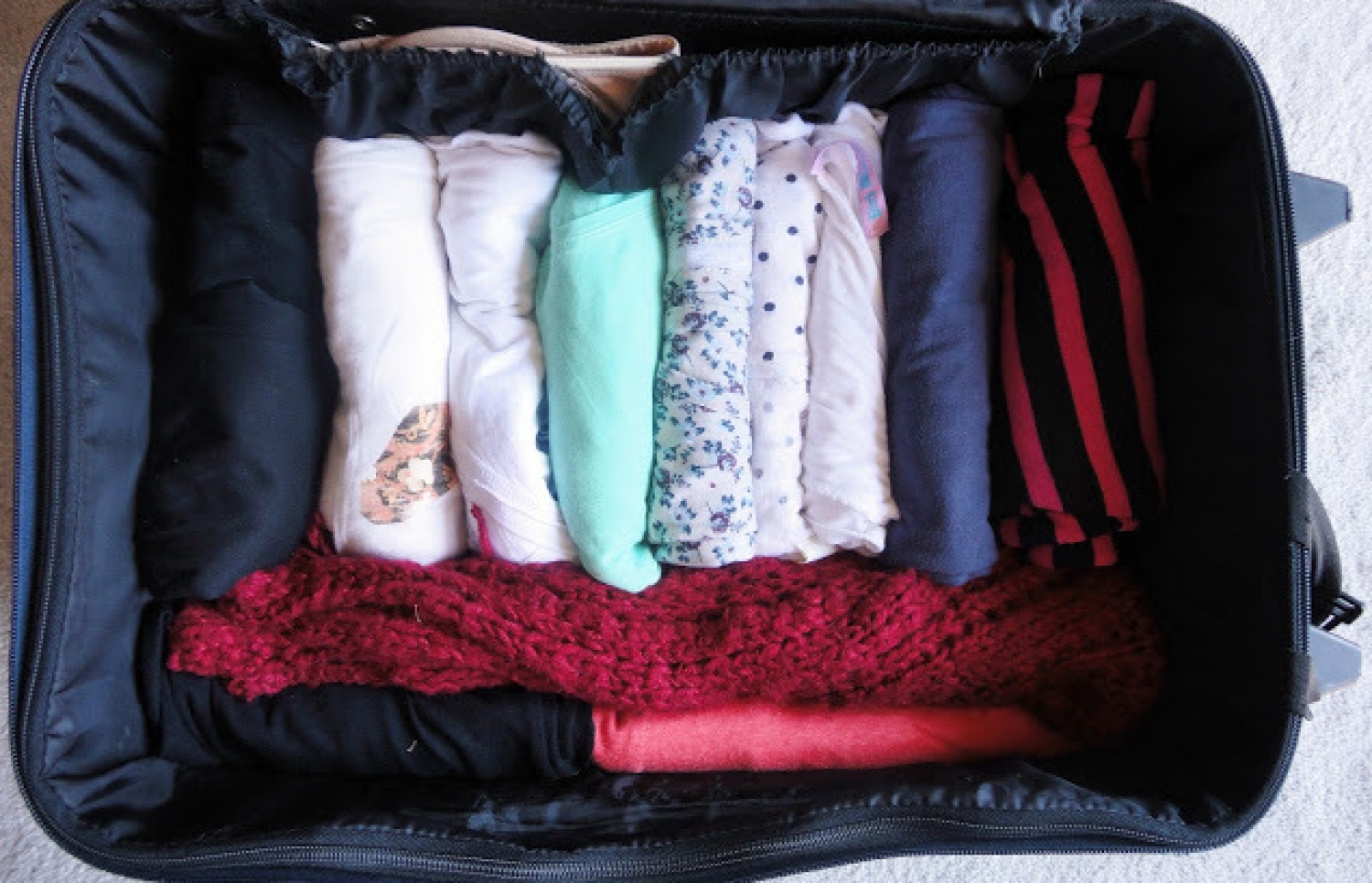One of the most pro-tips for packing is to roll up clothes instead of folding them. This helps to prevent crazy wrinkles and not to mention save up space.