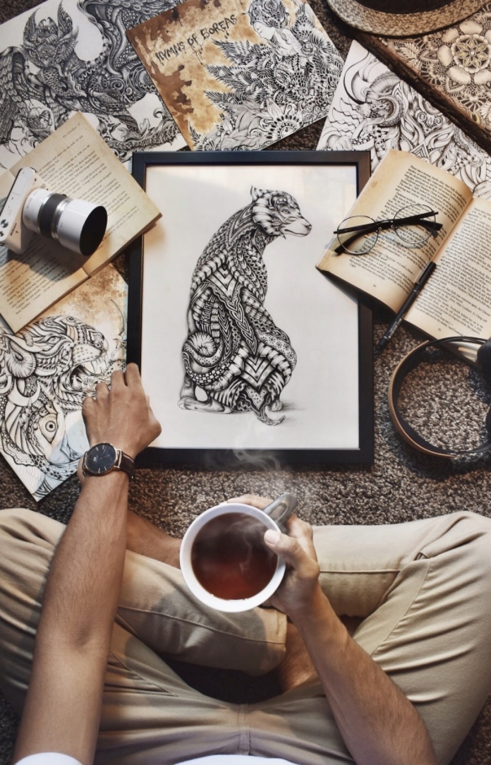 Maahee favours the Zentangle, an abstract art style that involves incorporating intricate patterns and geometric shapes to form a larger image.