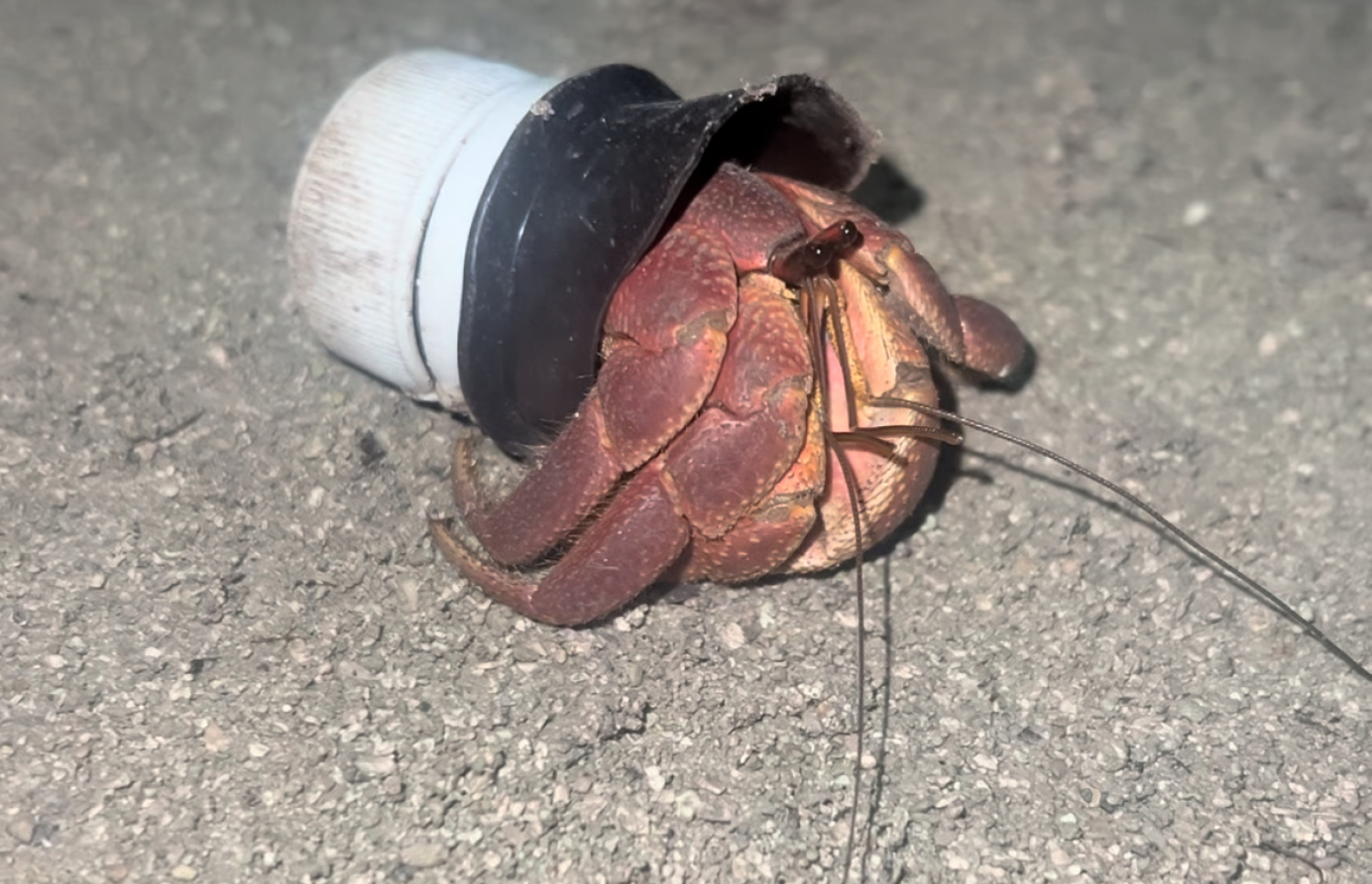 Halfway into the walk, they came across a hermit crab on the beach. While hermit crabs are a common sight on beaches, this particular one caught their interest as it had made its home not in a shell as would be expected, but a discarded plastic bottle cap.