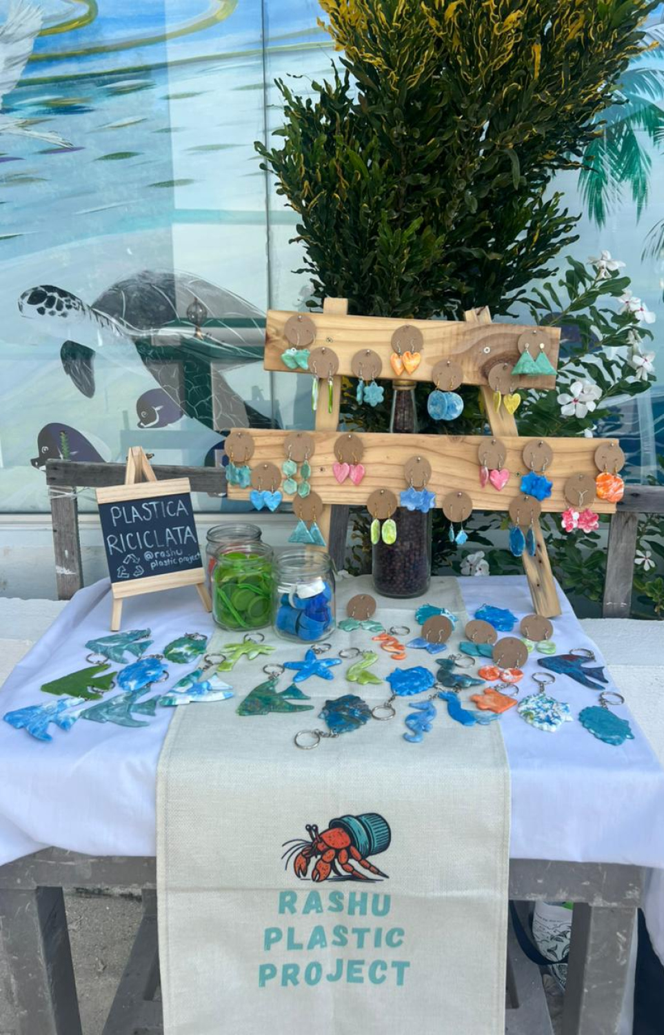 The project’s Thursday stall, visited by tourists staying in nearby resorts and guesthouses, displays an array of colourful turtles, rays and other designs in varying hues from turquoise to reds. They offer several variations of earrings, keychains, pendants, bracelets and more.