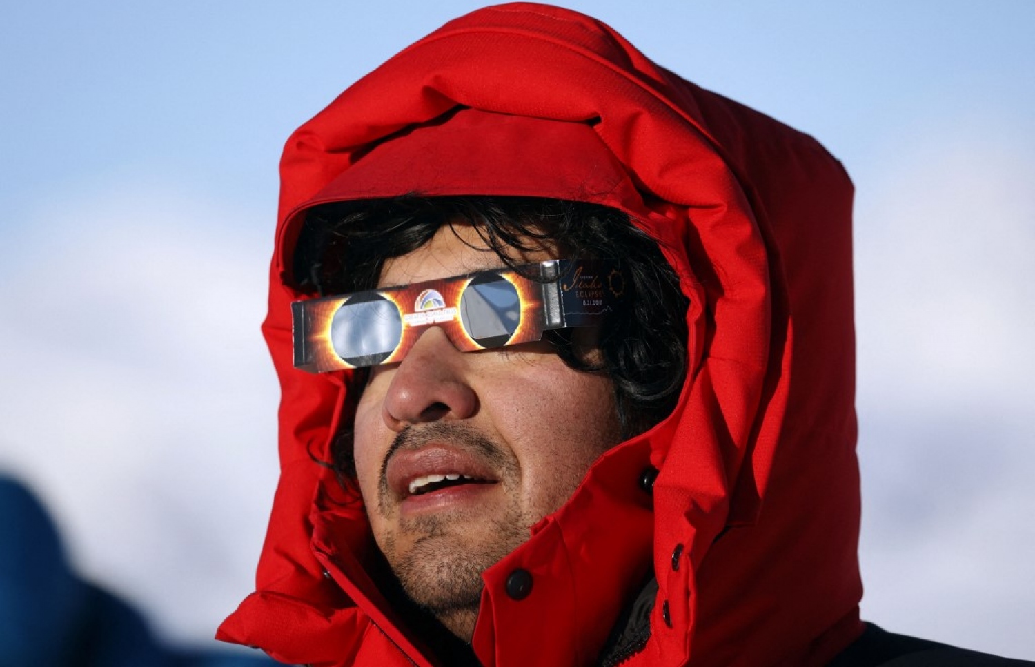 Handout picture released by Imagen Chile showing a Chilean scientist looking at a total solar eclipse from Union Glacier in Antarctica, on December 4, 2021. -- Photo: Felipe Trueba / Imagen Chile / AFP