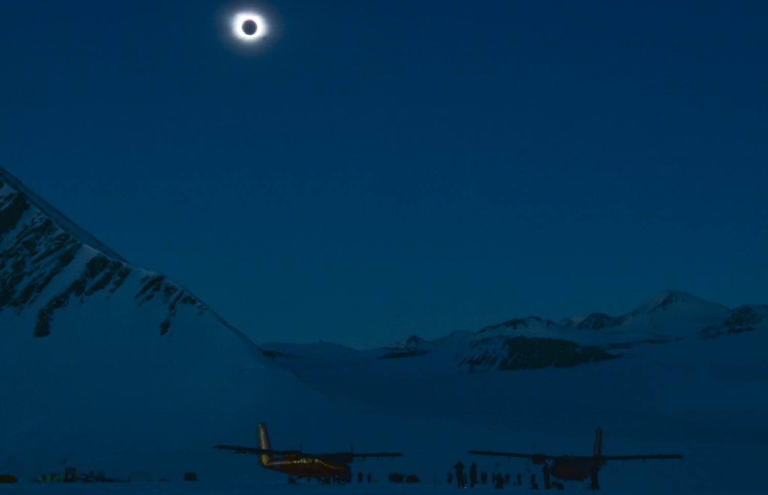 Handout picture released by the Chilean Air Force showing a total solar eclipse from Union Glacier in Antarctica, on December 4, 2021. -- Photo: Ricardo Soto / Chilean Air Force / AFP