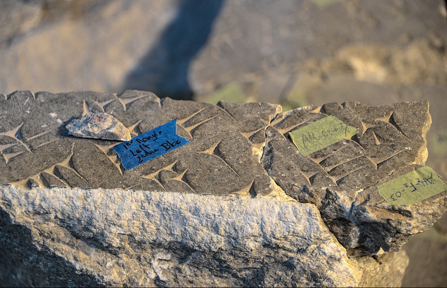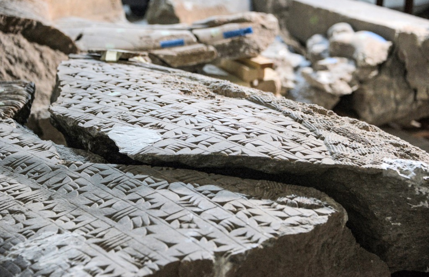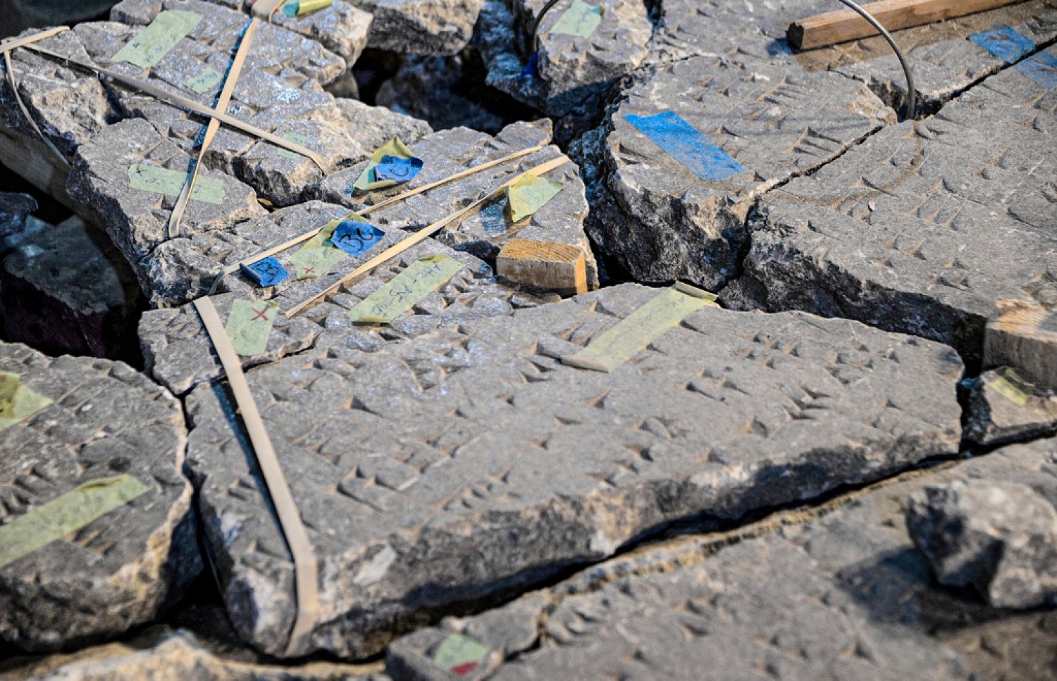 This picture taken on December 14, 2021 shows a fragment of an artefact bearing cuneiform inscriptions being reconstructed and reassembled at the Mosul Museum in Iraq's northern city. - In the damaged Mosul Museum, Iraqis supported by French restoration workers sort through the fragments of 2,500-year-old remains destroyed by jihadists, part of efforts aiming for reconstruction. -- Photo by Zaid Al-Obeidi/ AFP