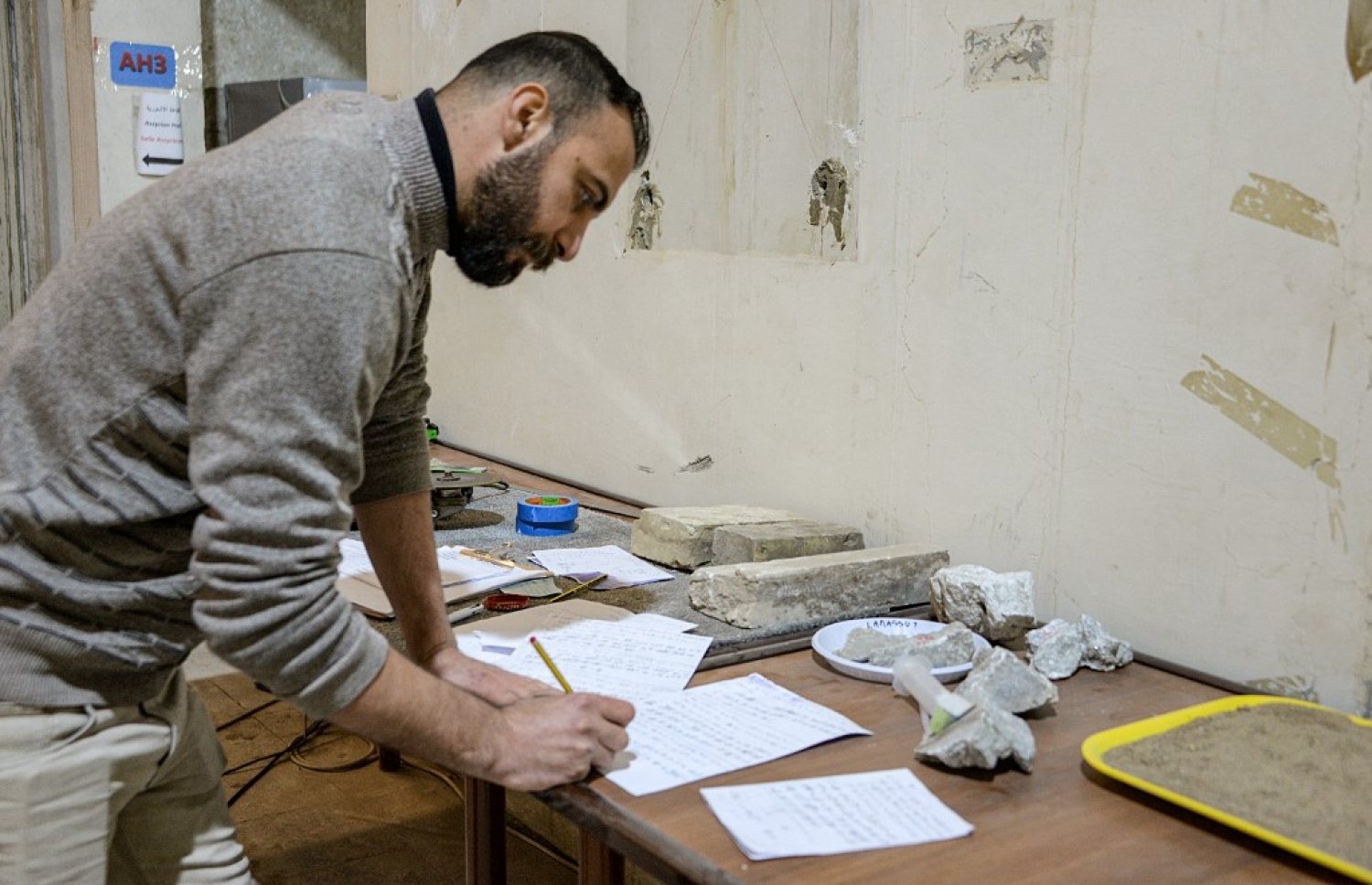 A worker at the Mosul Museum takes notes while analysing artefact fragments to be reconstructed and reassembled at the Mosul Museum in Iraq's northern city on December 14, 2021. - In the damaged Mosul Museum, Iraqis supported by French restoration workers sort through the fragments of 2,500-year-old remains destroyed by jihadists, part of efforts aiming for reconstruction. -- Photo: Zaid Al-Obeidi/ AFP