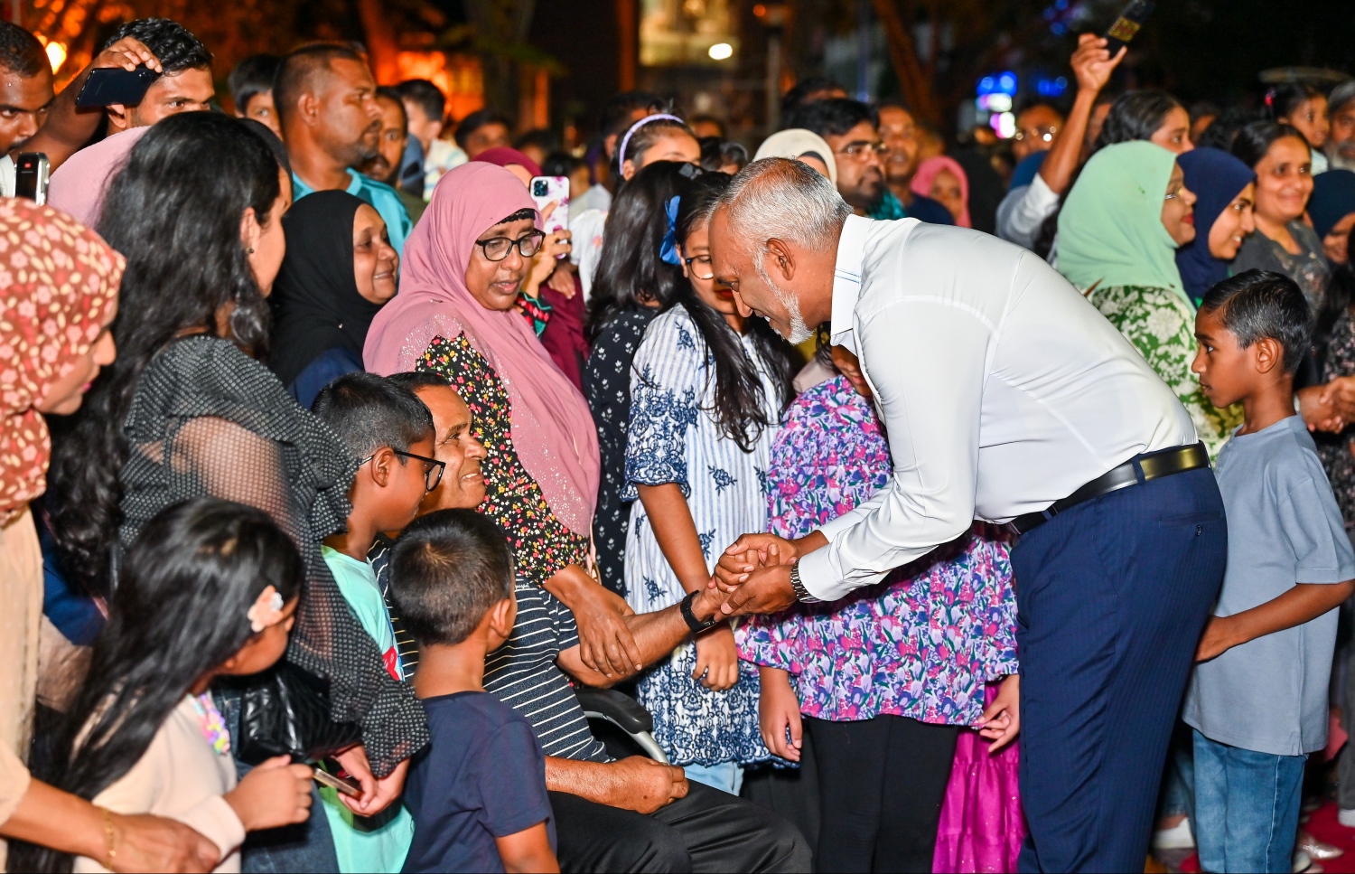 President Dr Muizzu greets members of the public who attended Monday night's 'Eid Ali' inauguration.-- Photo: Fayaz Moosa / Mihaaru