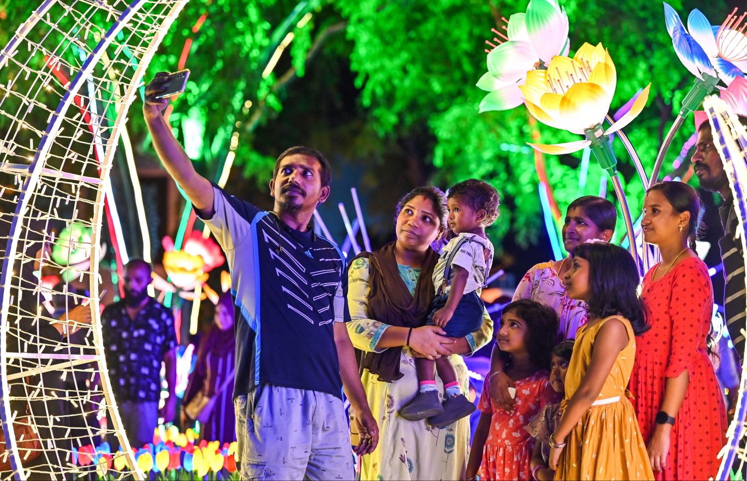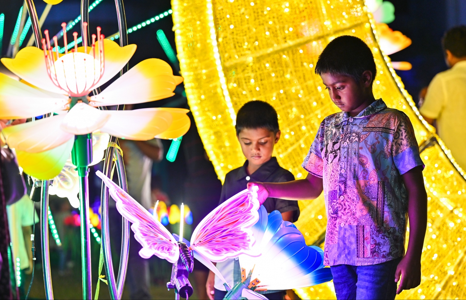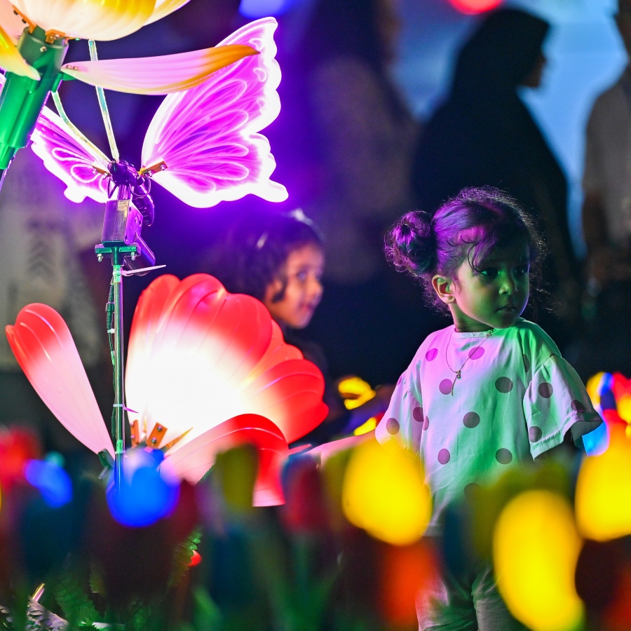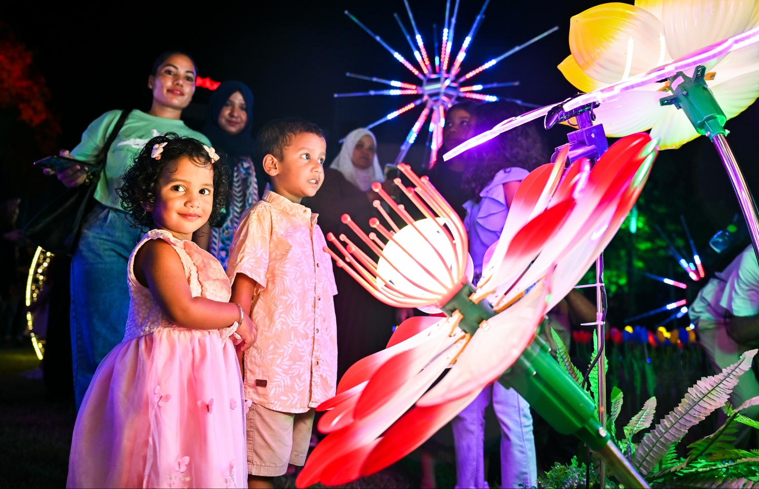 Children enjoying the sight of the lights in the shapes of butterflies and a bed of tulips.-- Photo: Fayaz Moosa / Mihaaru