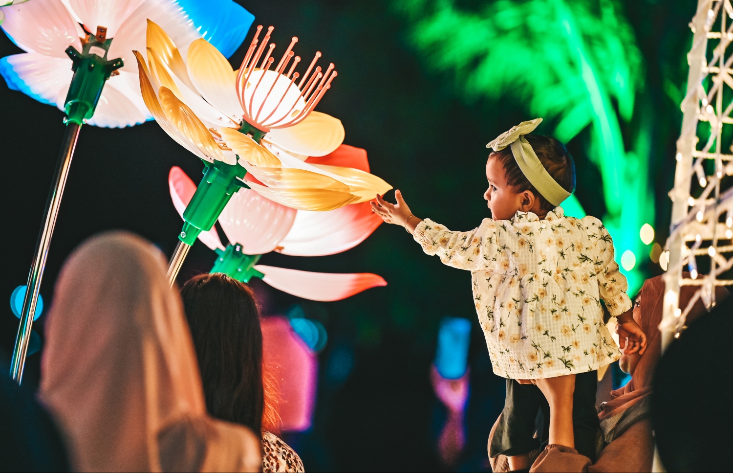 A baby reaches out curiously towards a large flower-shaped light at the Republic Square.-- Photo: Fayaz Moosa / Mihaaru