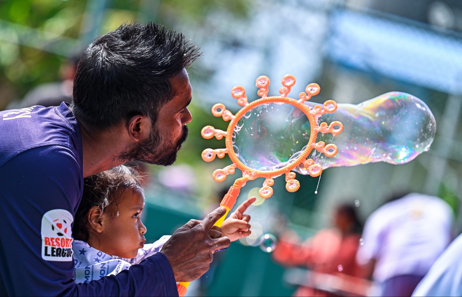 A child blowing bubbles with a parent at the Bubble Show held for children in Baa Kendhoo Volleyball Court to colorfully celebrate Eid-al-Adha festivities. -- Photo: Fayaz Moosa / Mihaaru News