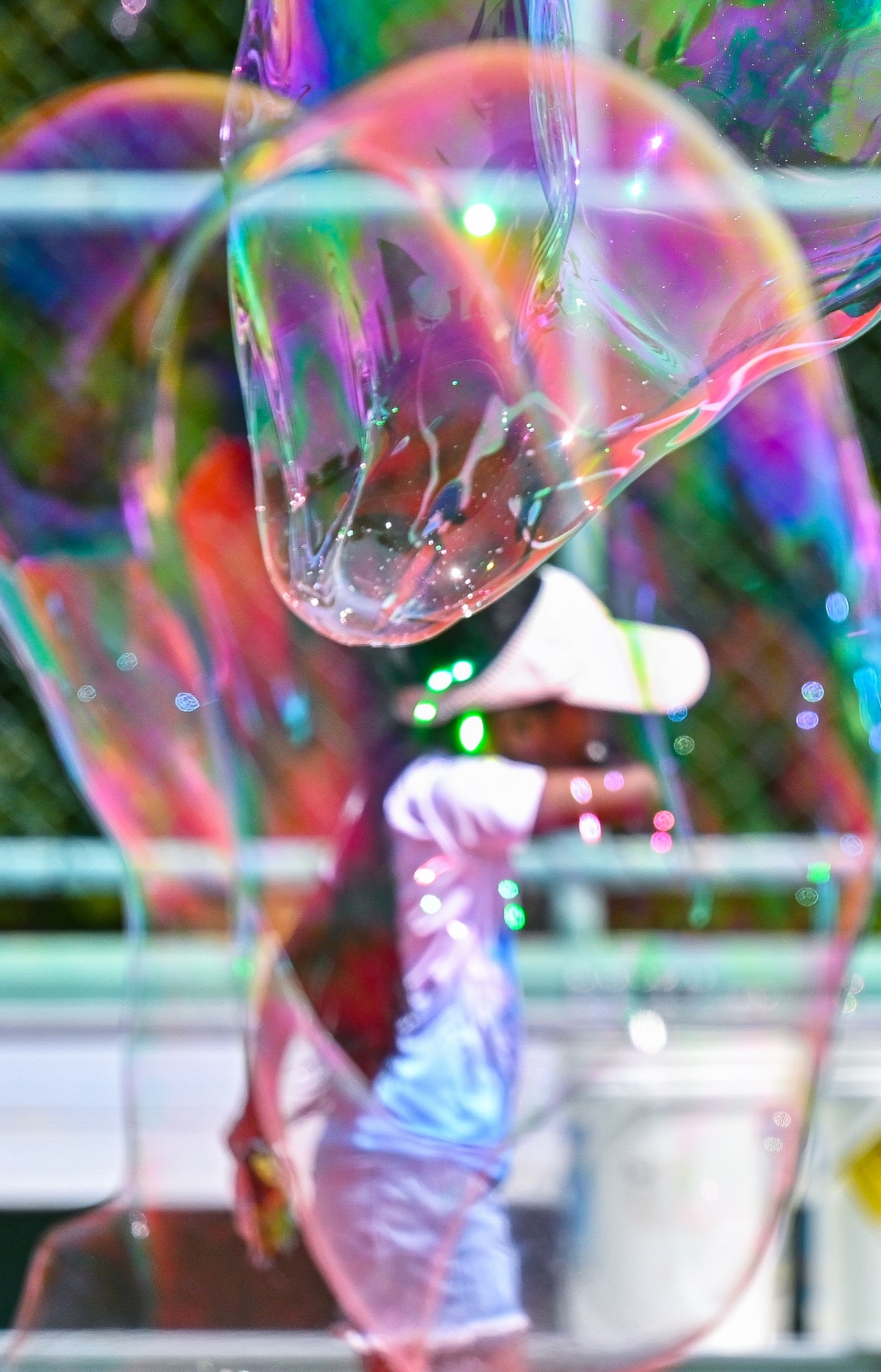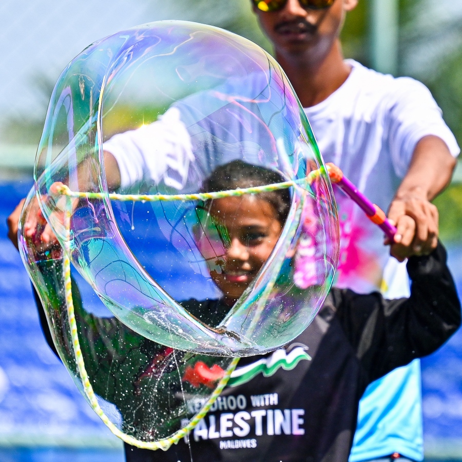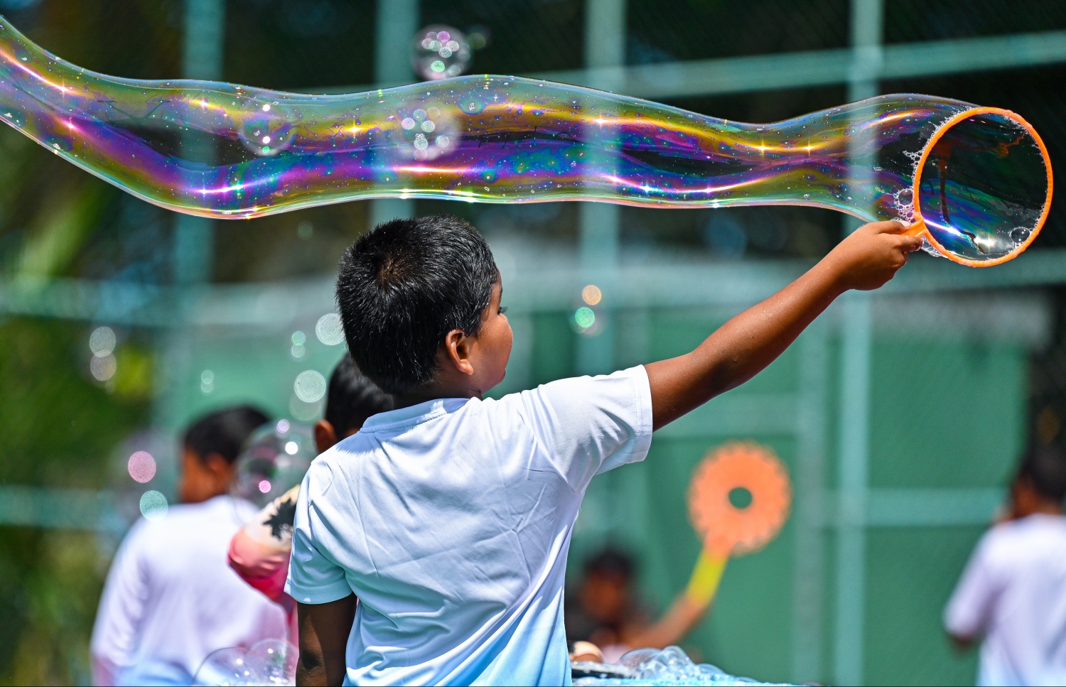 A child blowing bubbles at the Bubble Show held for children in Baa Kendhoo Volleyball Court to colorfully celebrate Eid-al-Adha festivities. -- Photo: Fayaz Moosa / Mihaaru News
