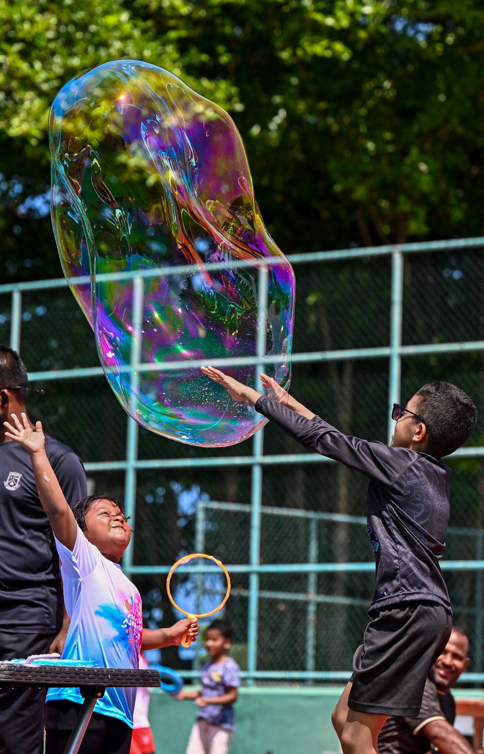 Children attempting to pop a bubble during the Bubble Show held for children in Baa Kendhoo Volleyball Court to colorfully celebrate Eid-al-Adha festivities. -- Photo: Fayaz Moosa / Mihaaru News