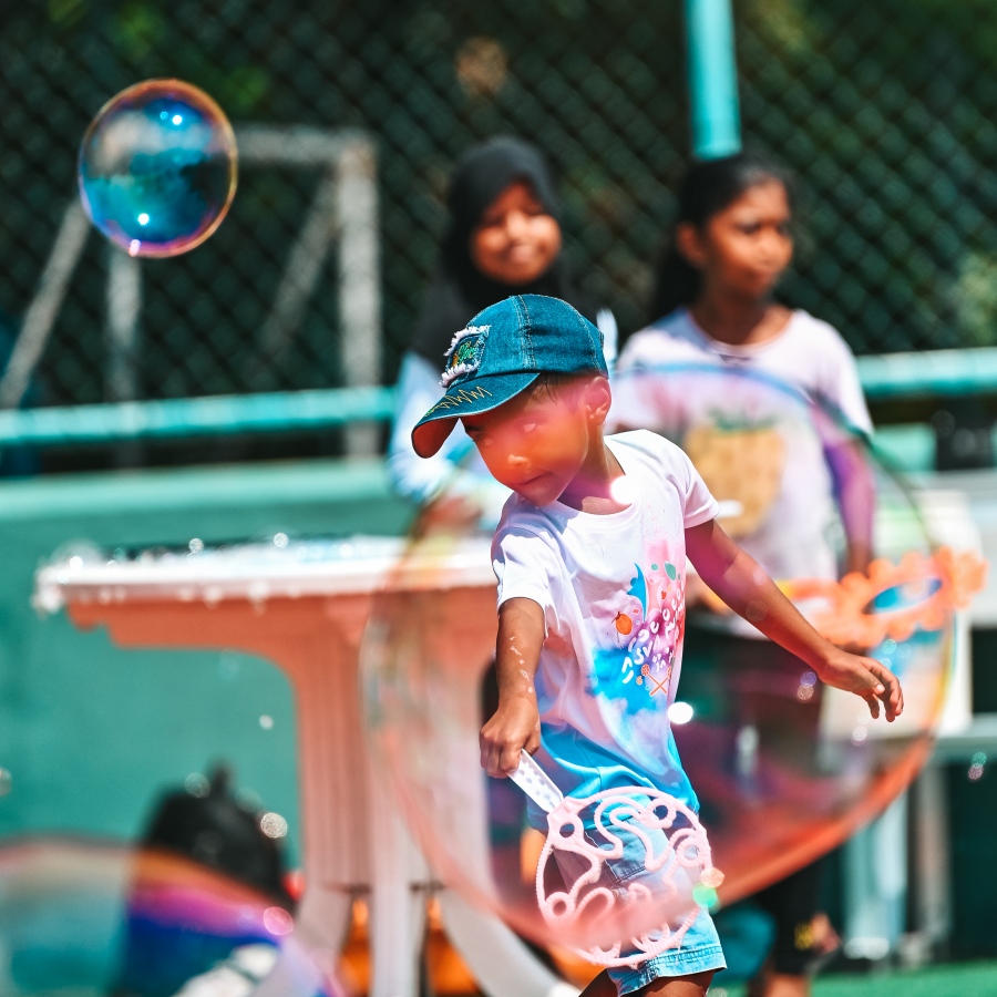 A child attempting to pop a bubble during the Bubble Show held for children in Baa Kendhoo Volleyball Court to colorfully celebrate Eid-al-Adha festivities. -- Photo: Fayaz Moosa / Mihaaru News