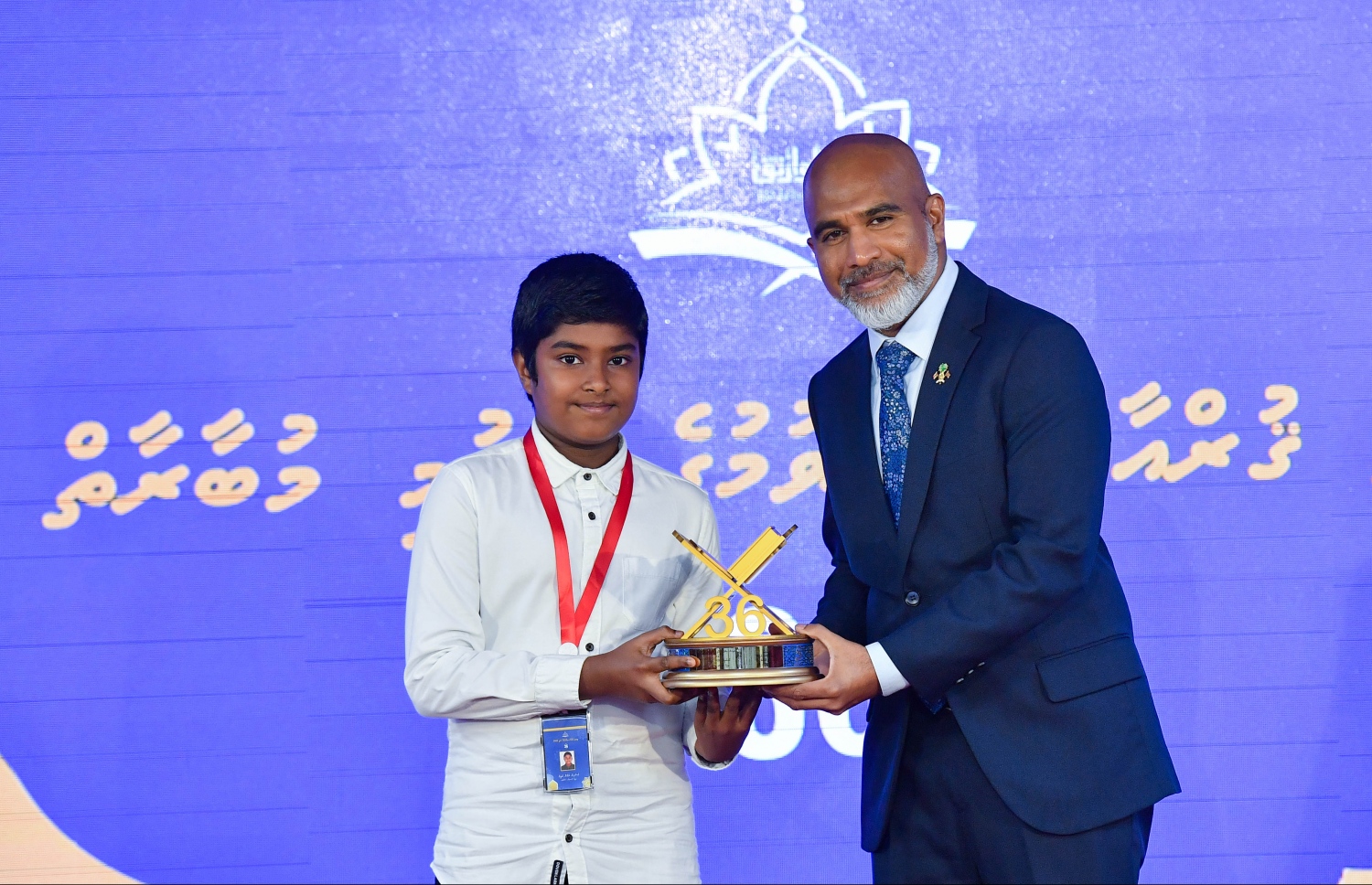 Minister of Islamic Affairs Mohamed Shaheem Ali Saeed presents an award at the closing ceremony of the 36th National Quran Competition.-- Photo: President's Office