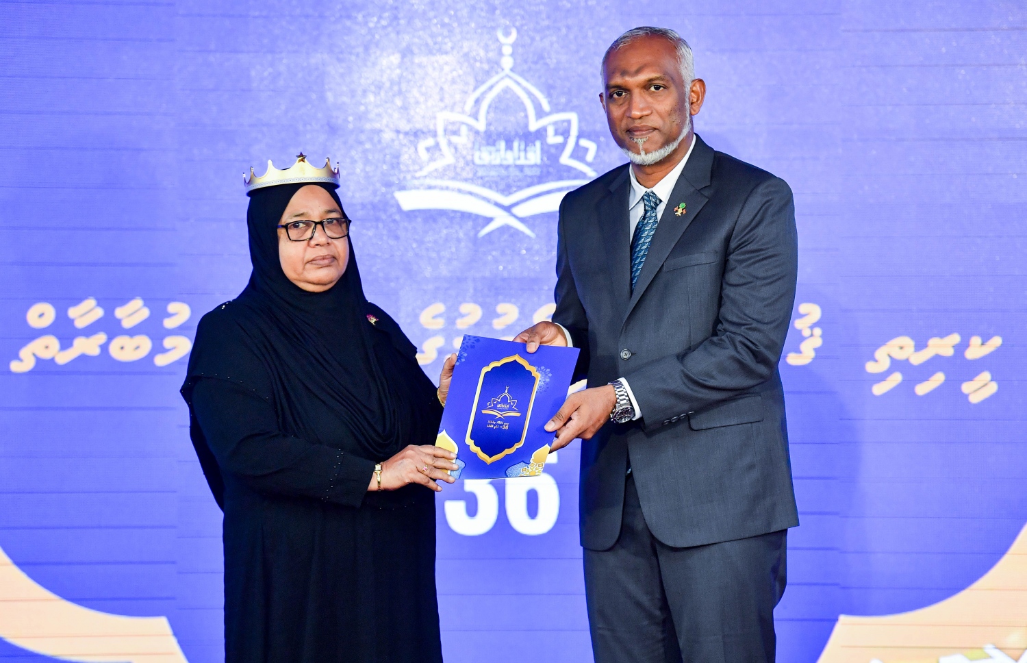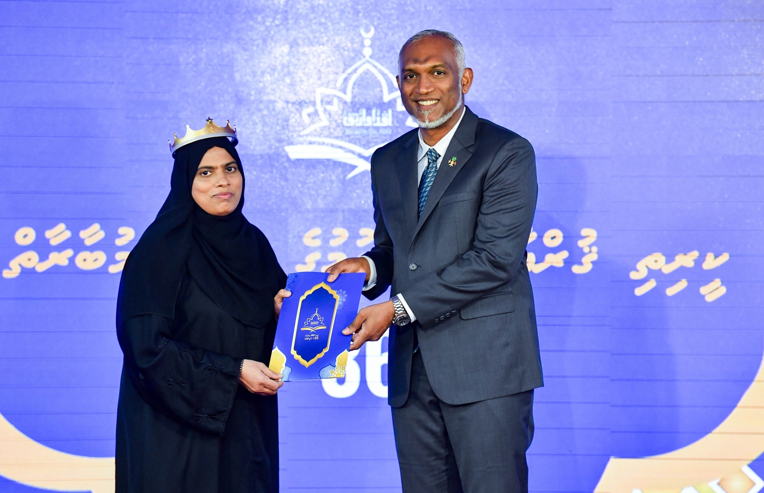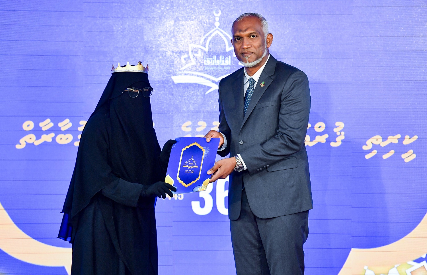 President Dr Mohamed Muizzu presents an award at the closing ceremony of the 36th National Quran Competition.-- Photo: President's Office