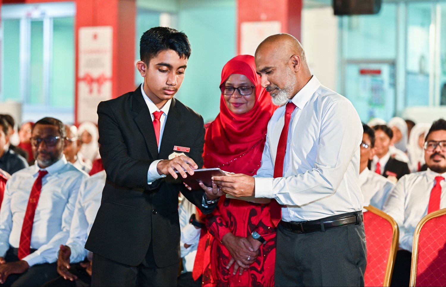 Minister of Education, Dr Ismail Shafeeu awarding a medal to a person who served Majeedhiyya School for 20 consecutive years. -- Photo: Fayaz Moosa / Mihaaru News