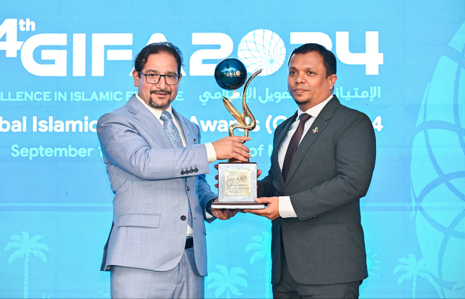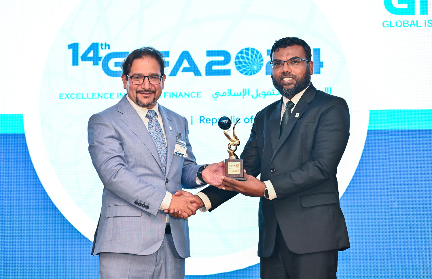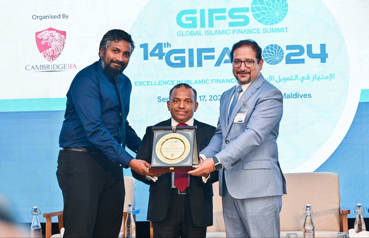 A representative of Maldives Islamic Bank (MIB) receiving the GIFA award presented to the bank. -- Photo: Fayaz Moosa / Mihaaru News