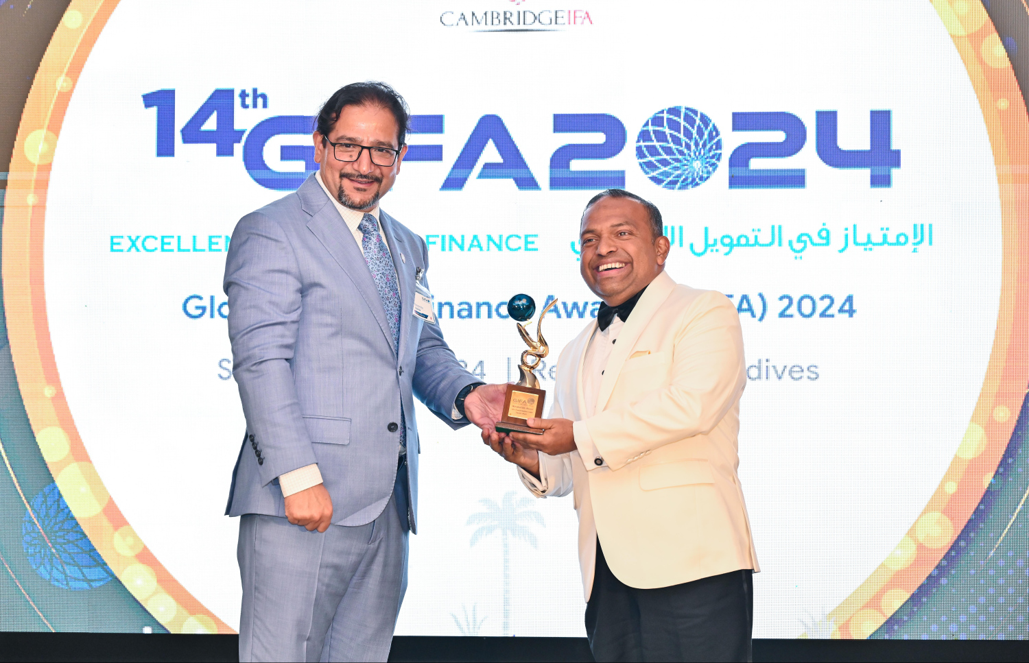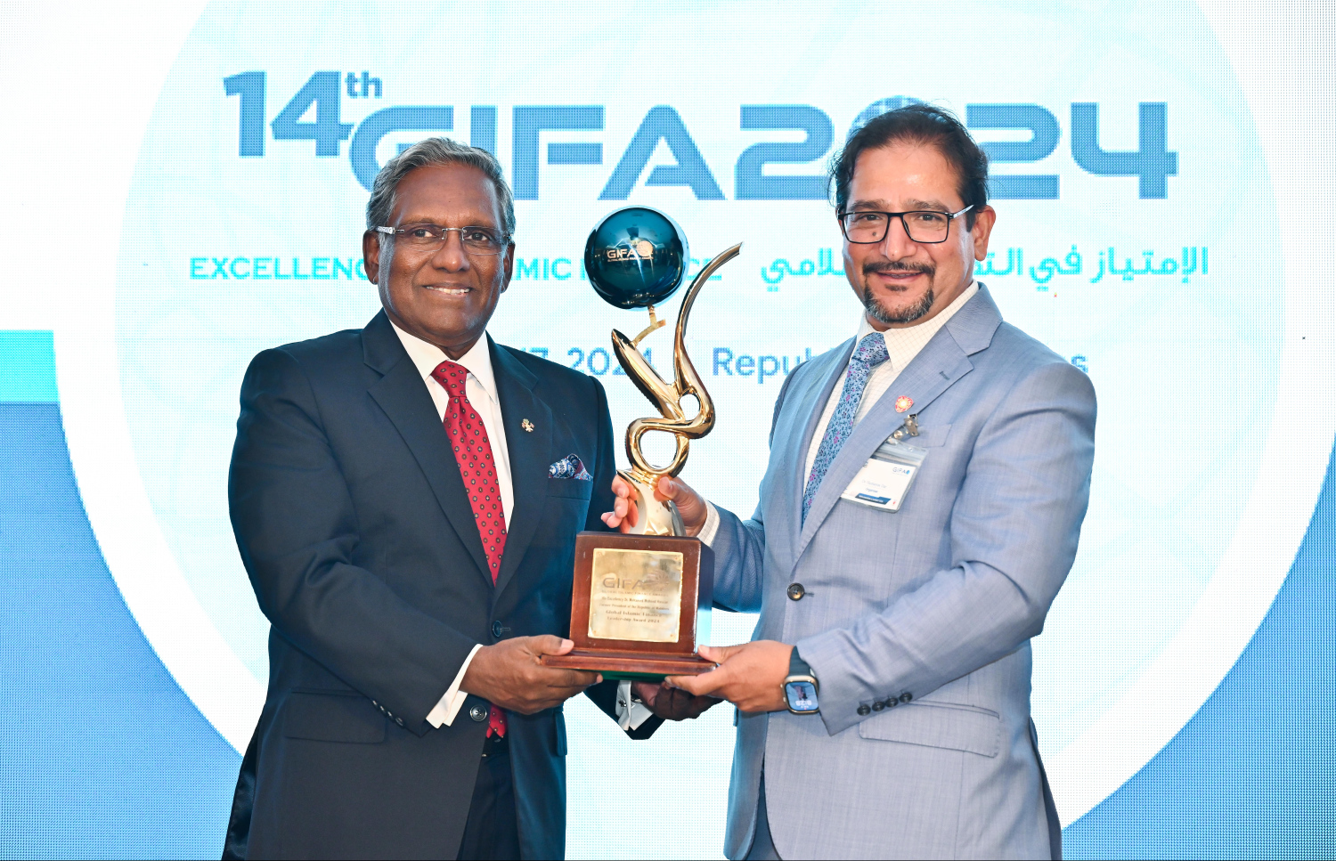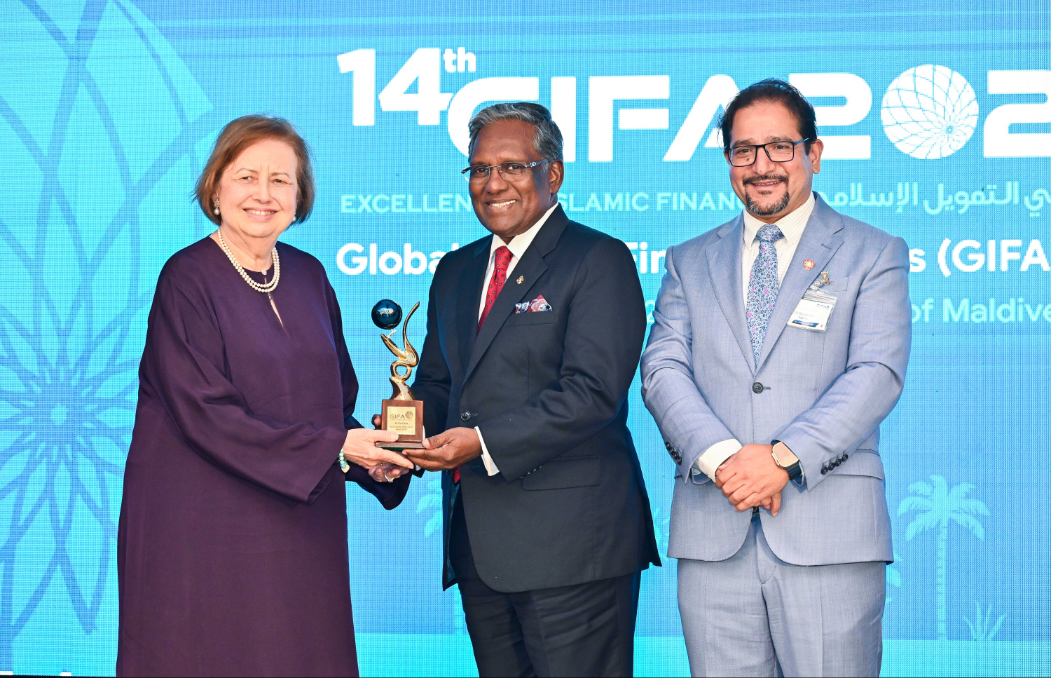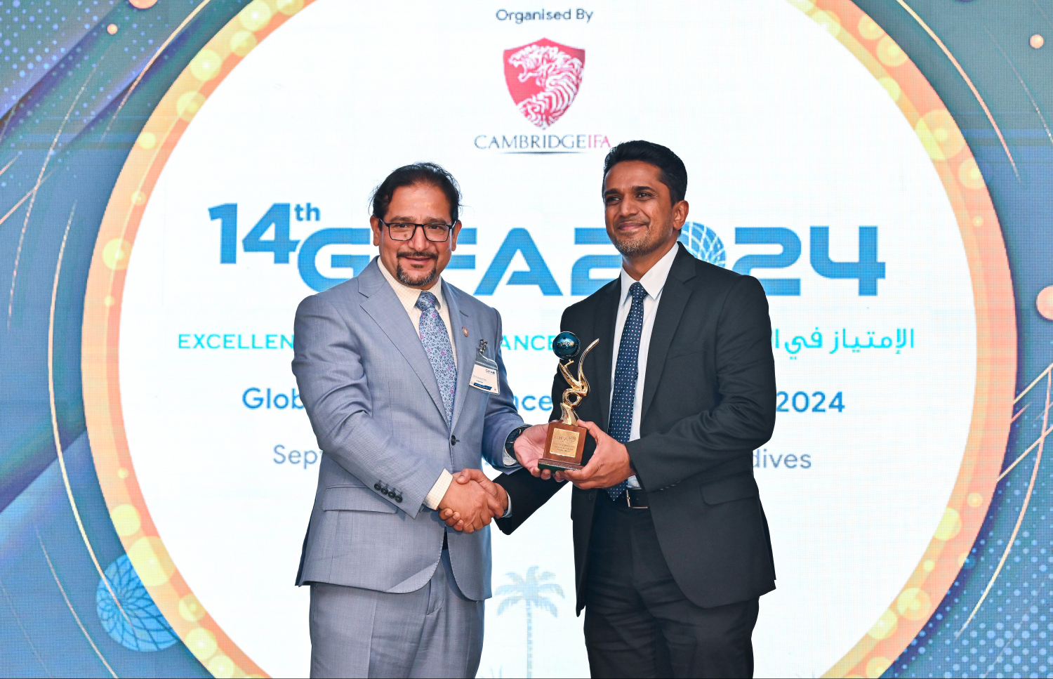 A representative of Maldives Islamic Bank (MIB) receiving the GIFA award presented to the bank. -- Photo: Fayaz Moosa / Mihaaru News