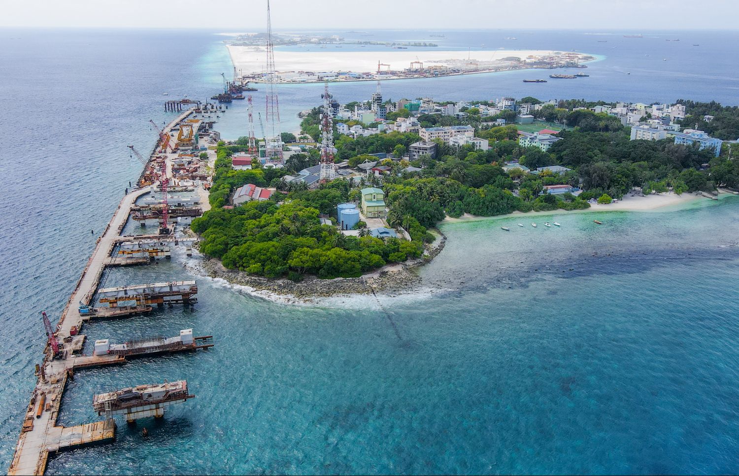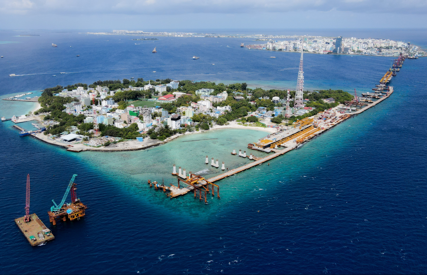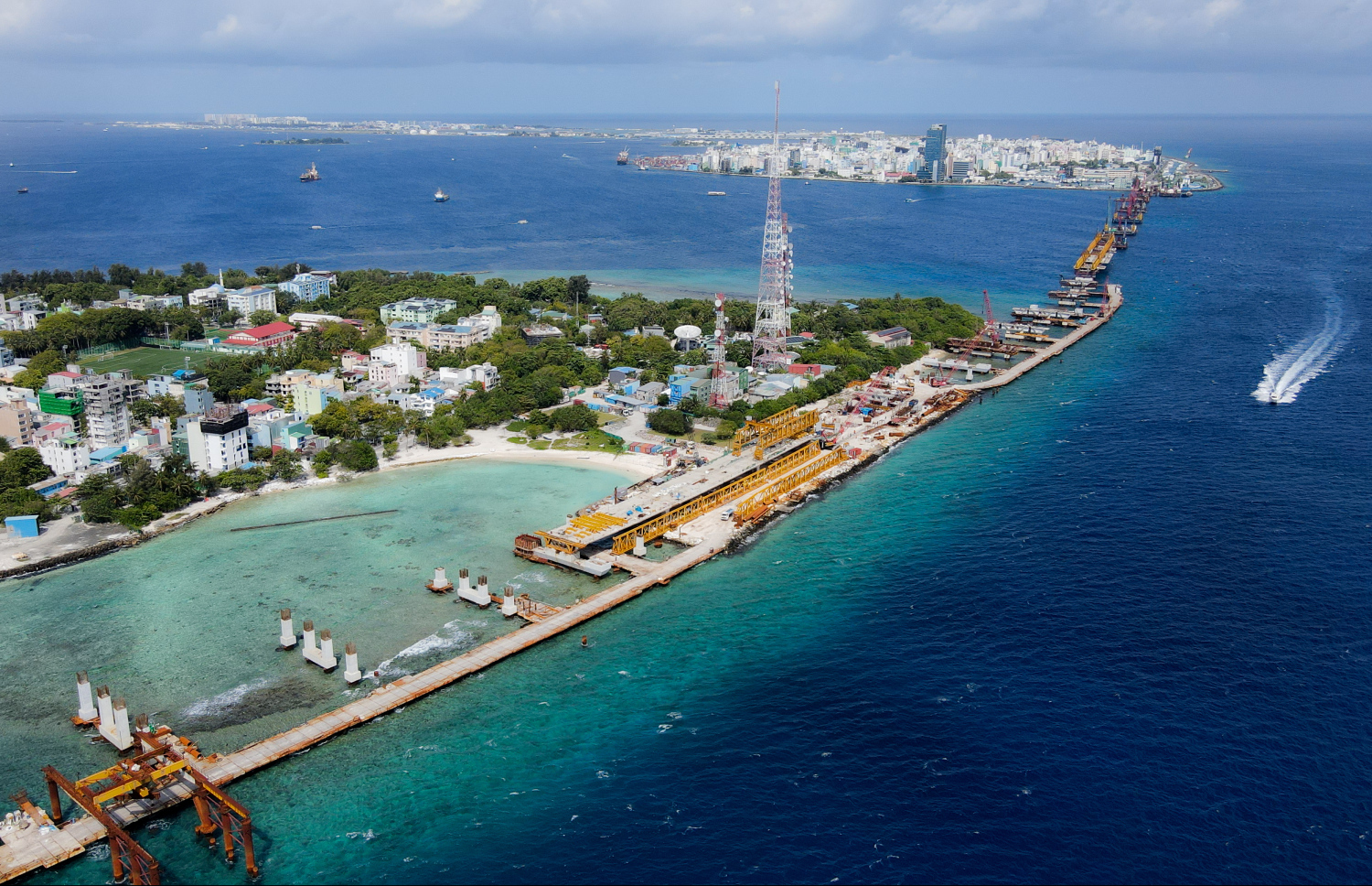 Thilamalé Bridge construction in progress. Aerial view of the bridge area connecting Malé and Villimalé. Super structures are now being laid out -- Photo: Nishan Ali | Mihaaru