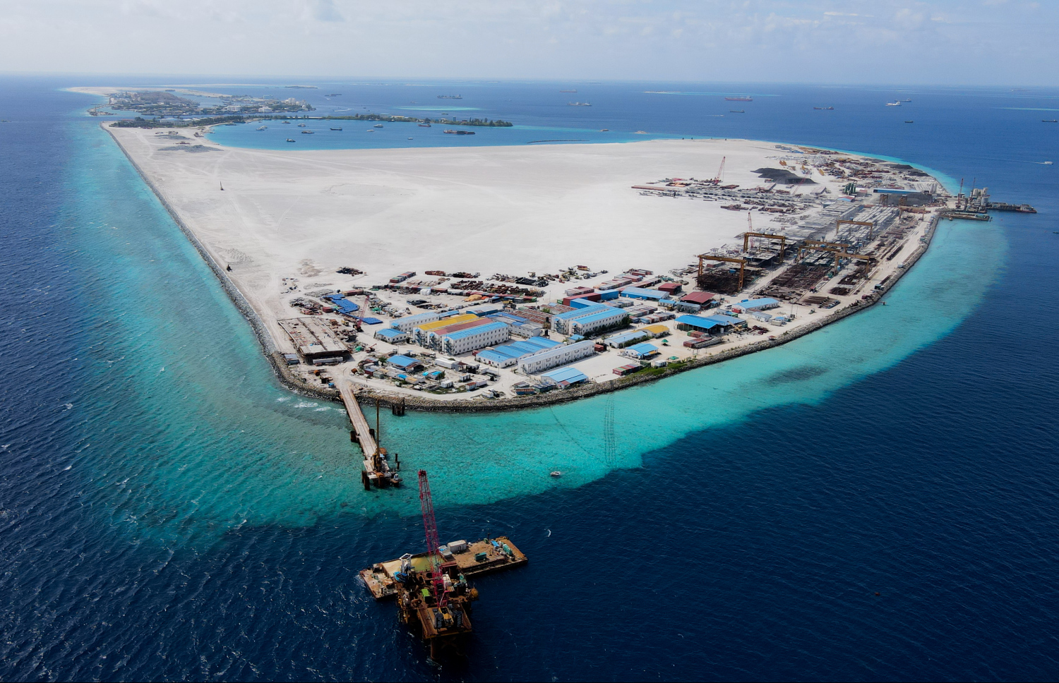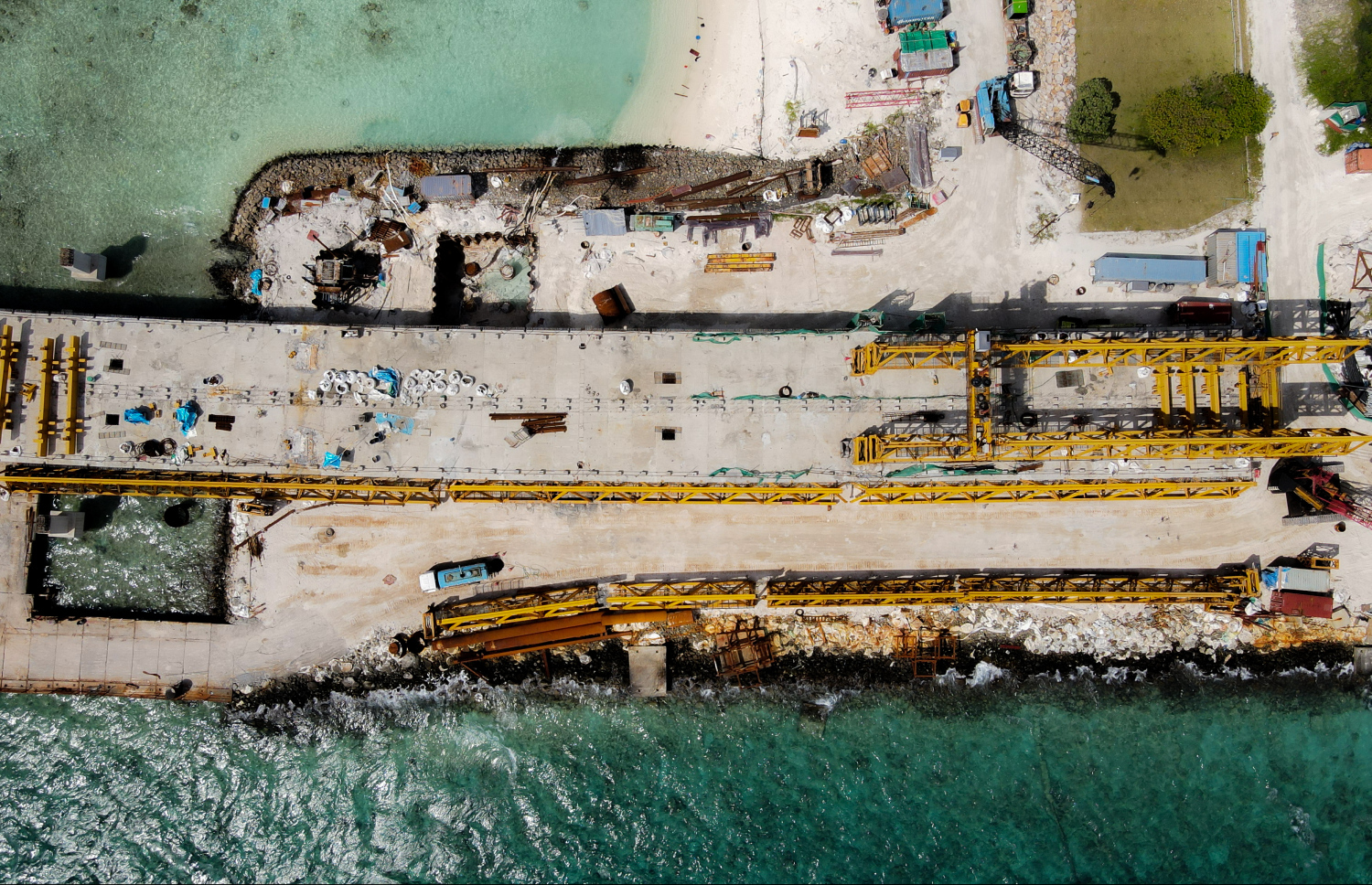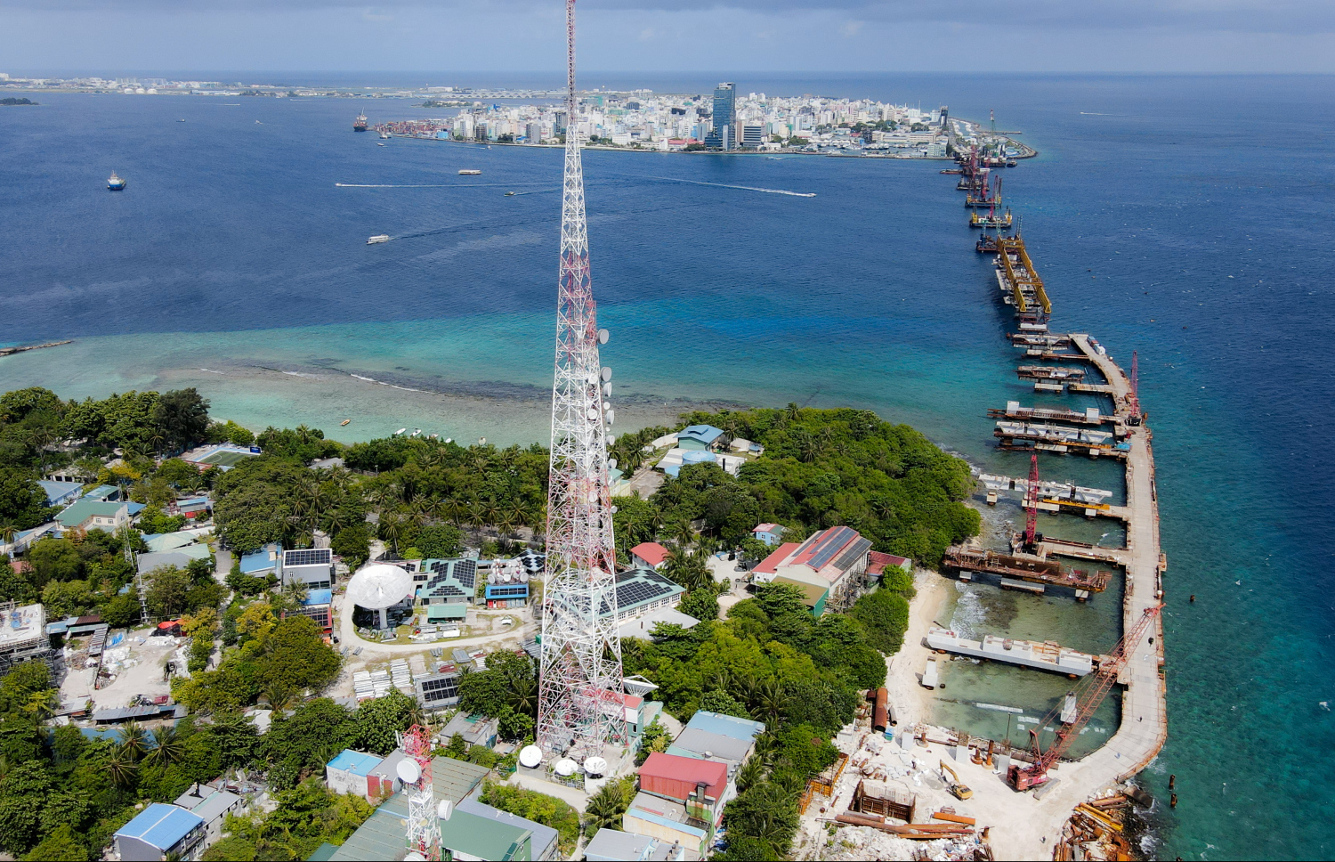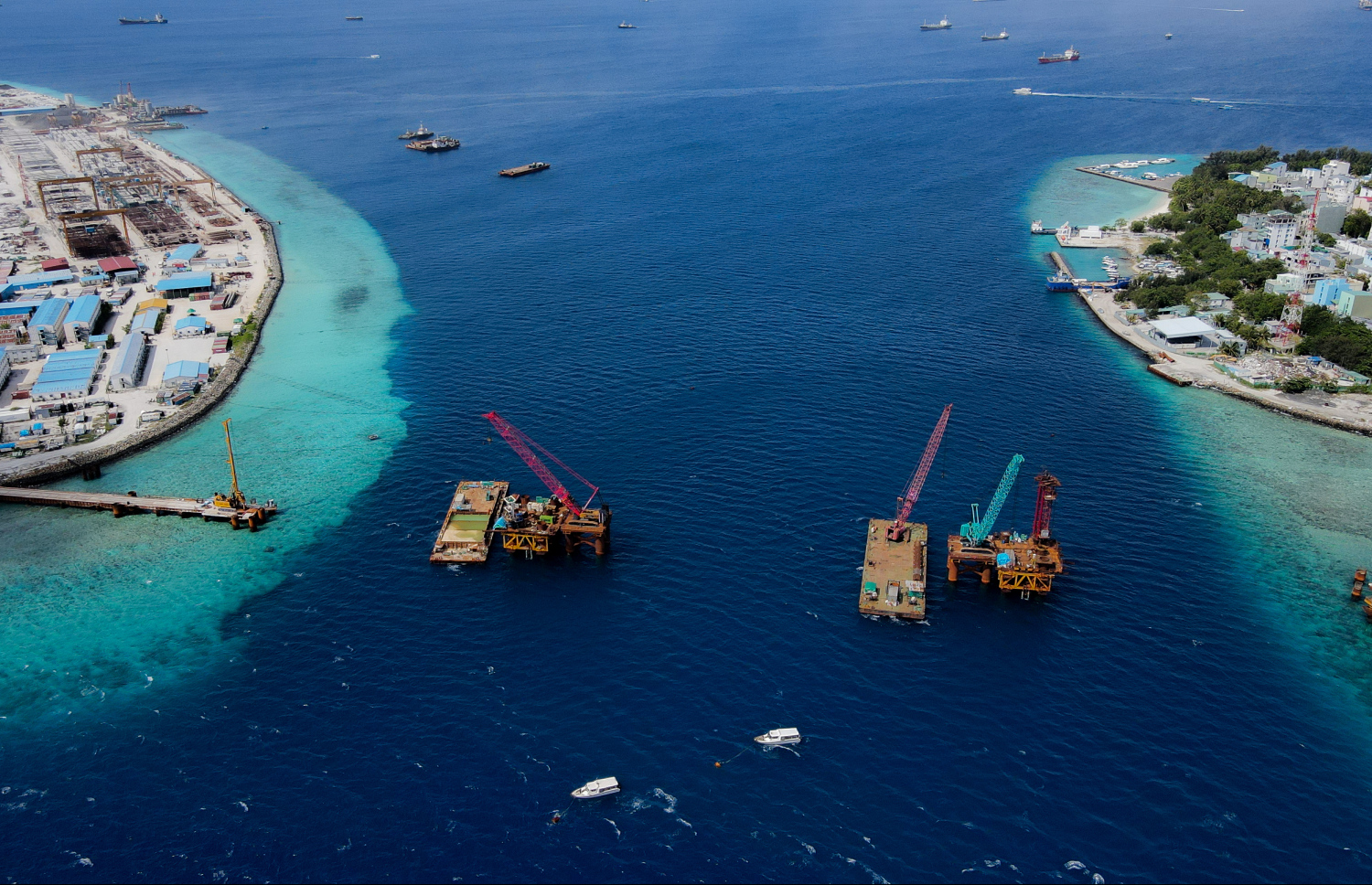 Thilamalé Bridge construction in progress. Aerial view of the bridge area connecting Malé and Villimalé. Super structures are now being laid out -- Photo: Nishan Ali | Mihaaru