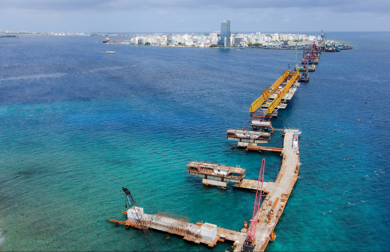 Thilamalé Bridge development in progress. The super structures of the 6.7 kilometre bridge are now being laid out -- Photo: Nishan Ali | Mihaaru