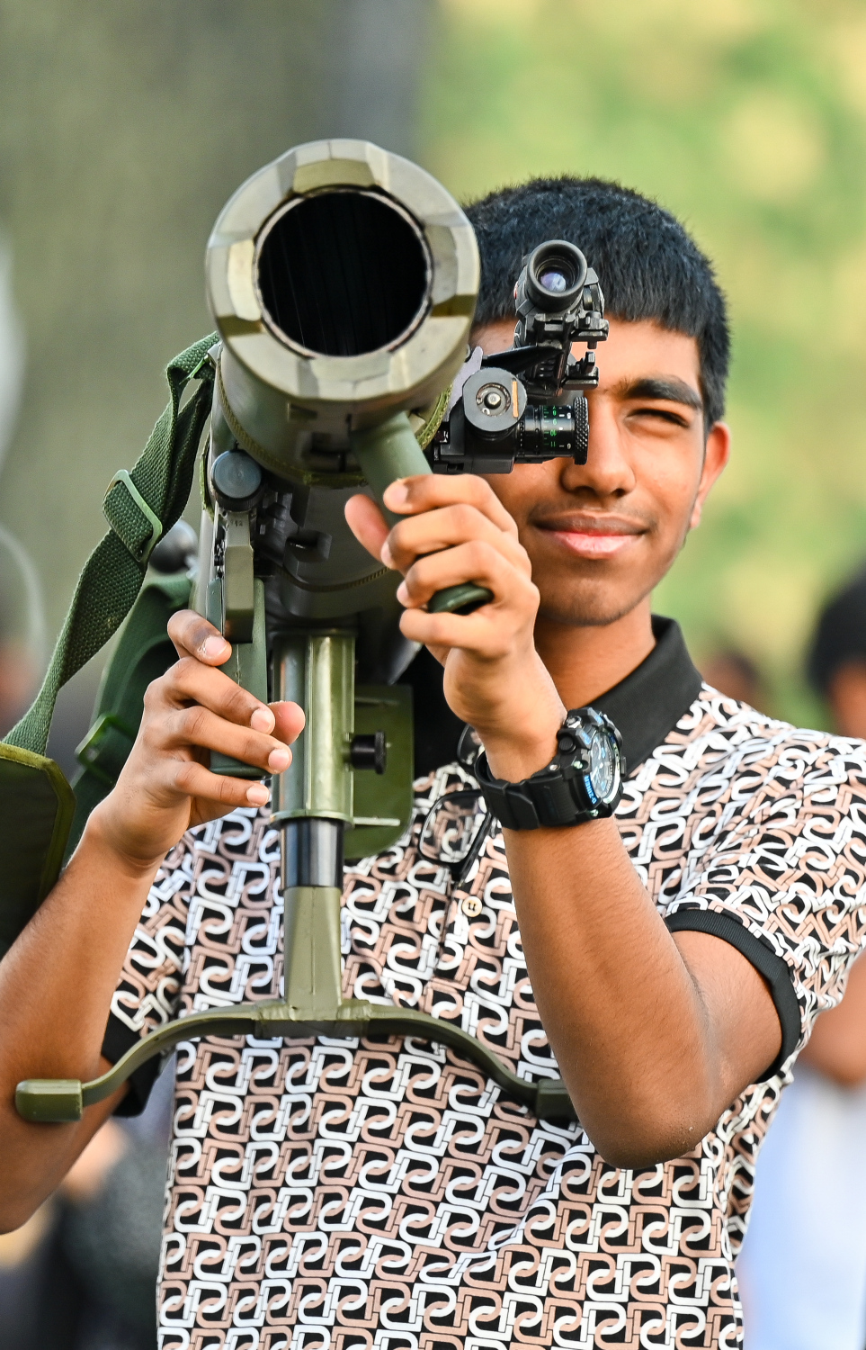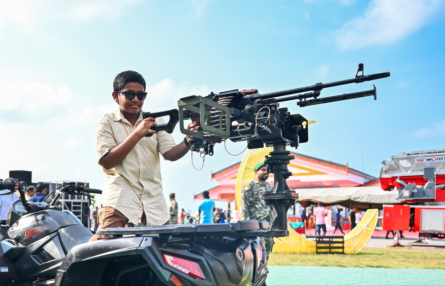 A child posing with MNDF's equipment during the Eid Evening -- Photo: Fayaz Moosa | Mihaaru