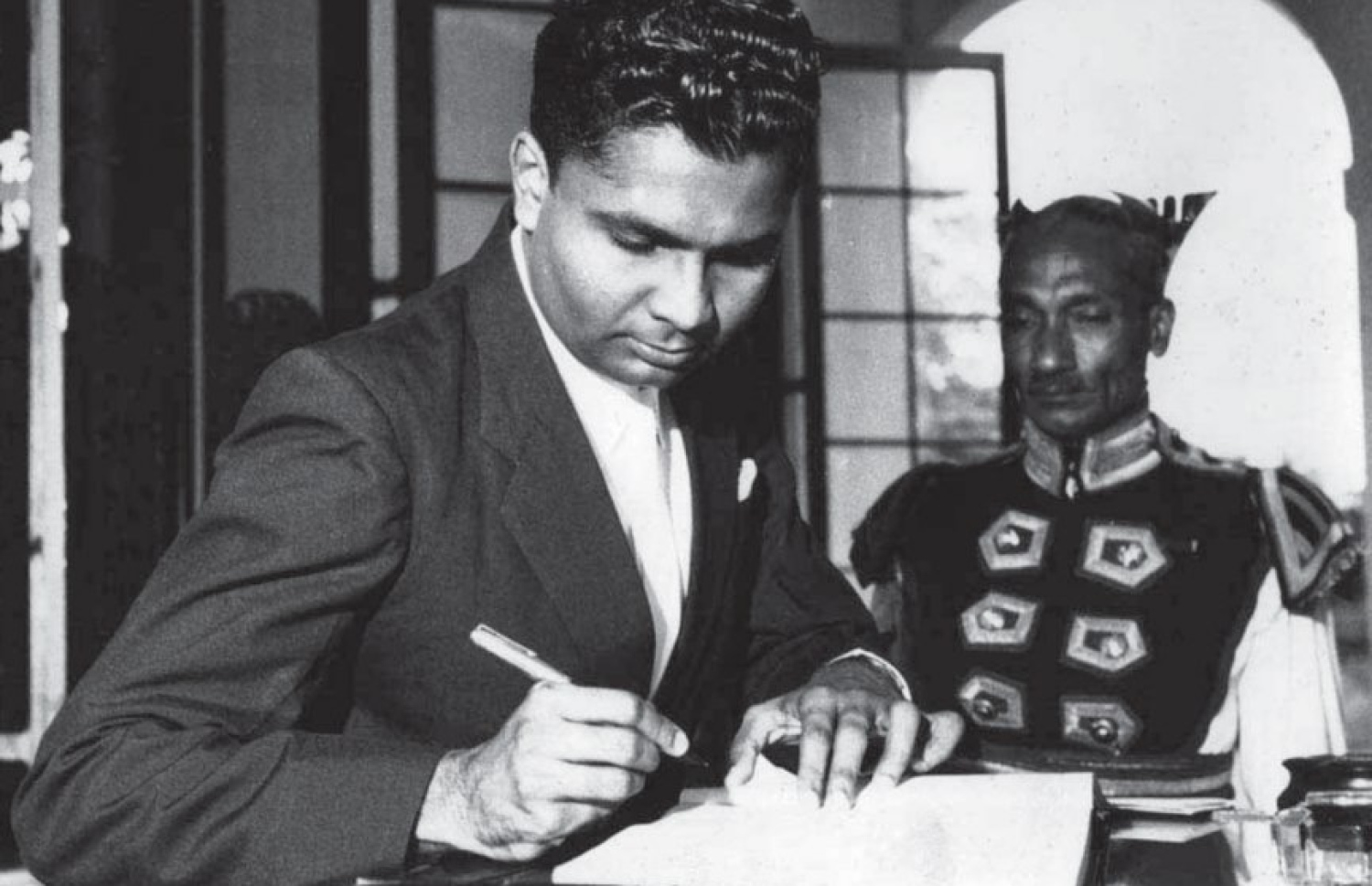 Maldives Ambassador to Sri Lanka, Abdul Sattar Moosa Didi, signs the document after taking office: Abdul Sattar was one of the leading figures in the discussions for Maldives independence with the British – Photo: National Archives of Maldives