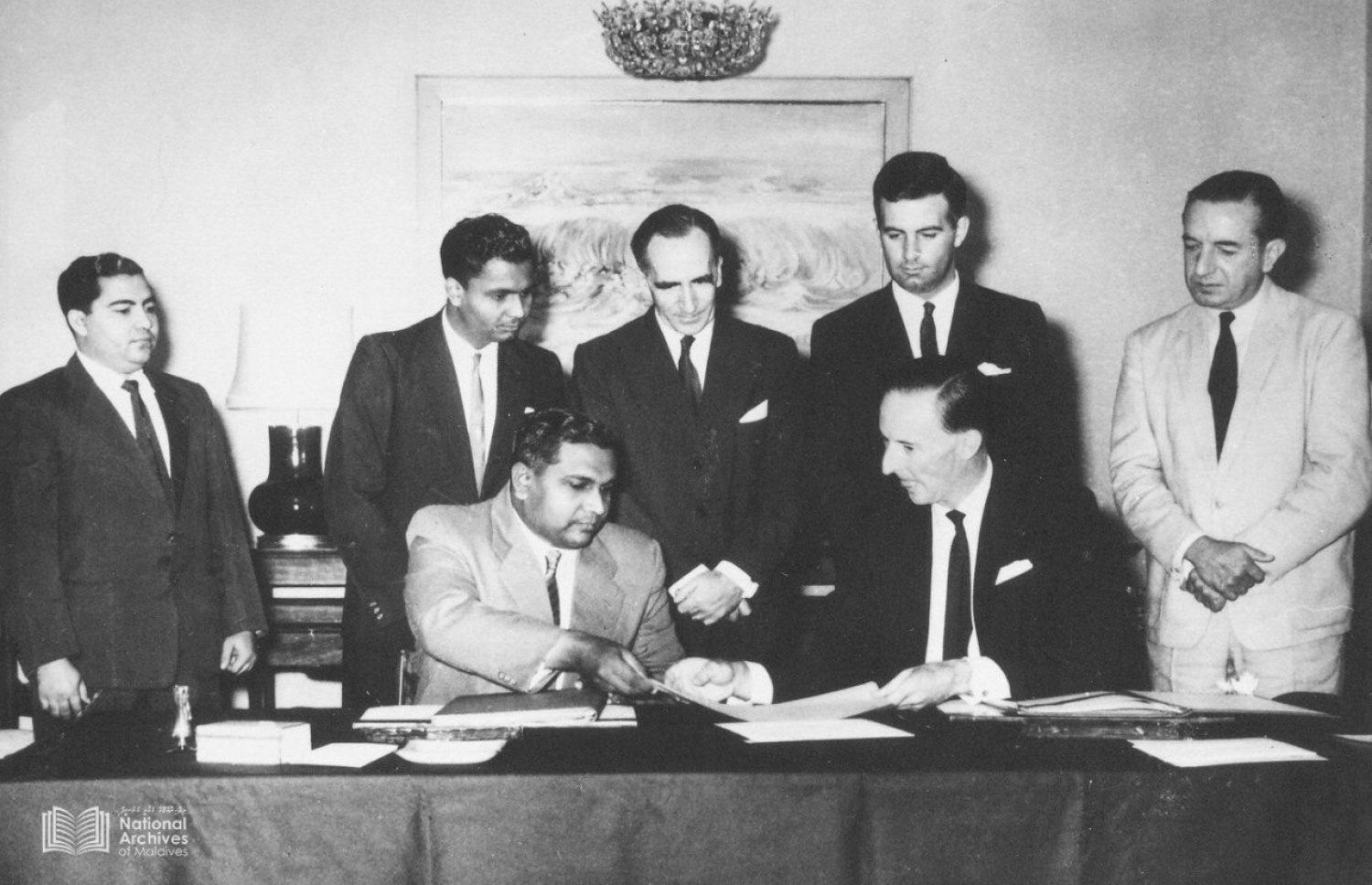 Maldives Prime Minister Ibrahim Nasir and British High Commissioner Michael Walker sign the Treaty of Independence in Colombo, Sri Lanka on July 26, 1965 -- Photo: National Archives of Maldives