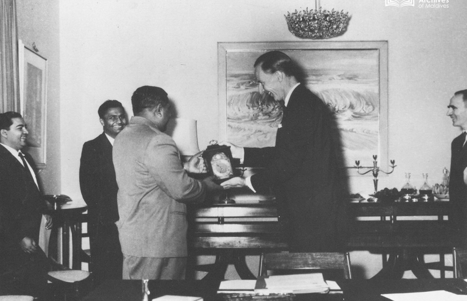 Maldives Prime Minister Ibrahim Nasir and British High Commissioner Michael Walker exchange tokens after signing the Treaty of Independence in Colombo, Sri Lanka on July 26, 1965 -- Photo: National Archives of Maldives