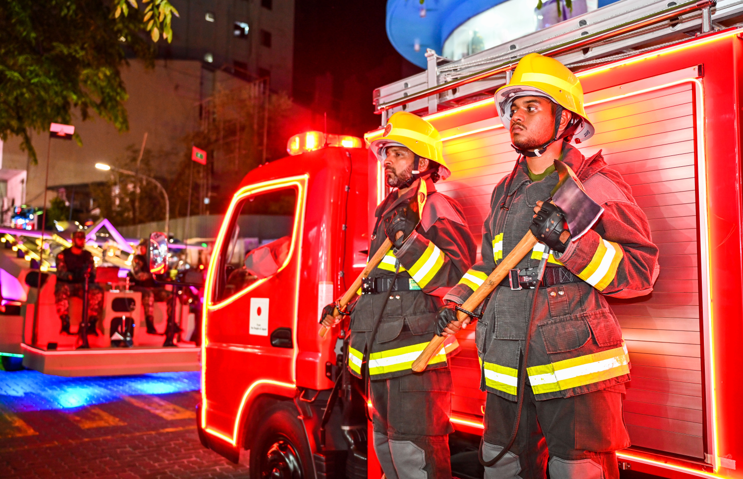 Firefighters in full gear standing at attention next to their firetruck -- Photo Credit: Fayaz Moosa, Mihaaru