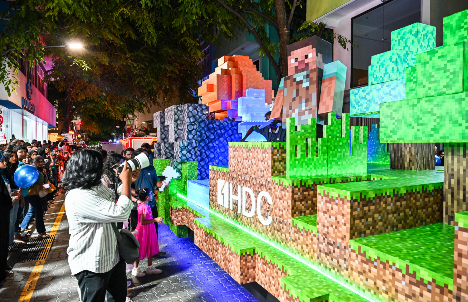 HDC's Minecraft themed float being the center of attention with photos being taken and eyes transfixed -- Photo Credit: Fayaz Moosa, Mihaaru
