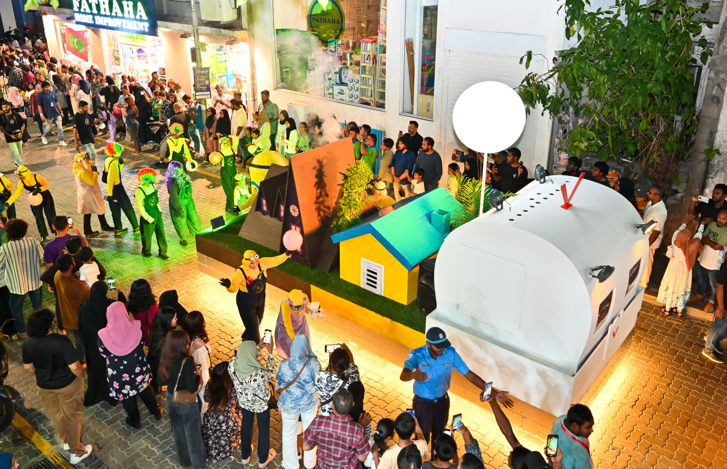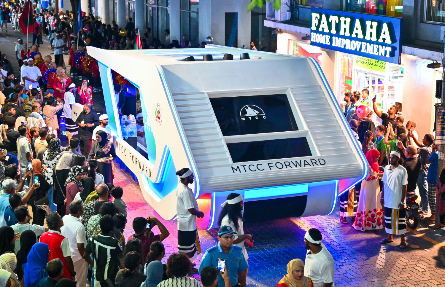 MTCC's unique float slowly pushing through Majeedhee Magu -- Photo Credit: Fayaz Moosa, Mihaaru