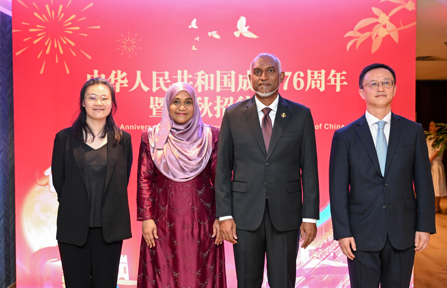 President Muizzu and his wife poses for a photo with Chinese Ambassador Kong Xianwa at a ceremony to mark China's 79th National Day