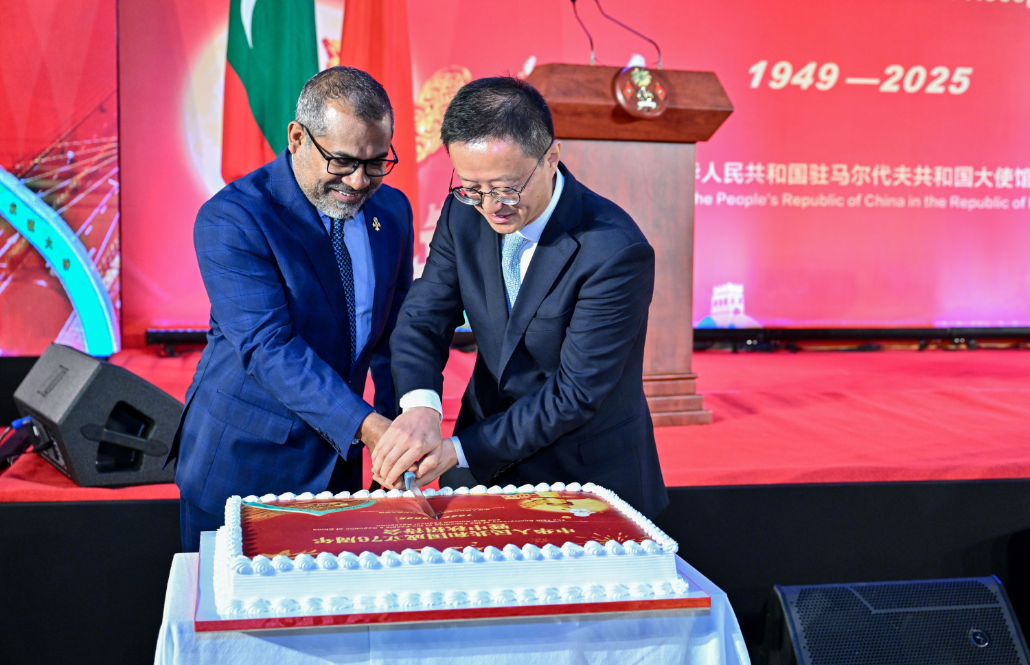 Foreign Minister Dr Abdullah Haleel and Chinese Ambassador Kong Xianwa unveil a cake to mark China's 79th National Day