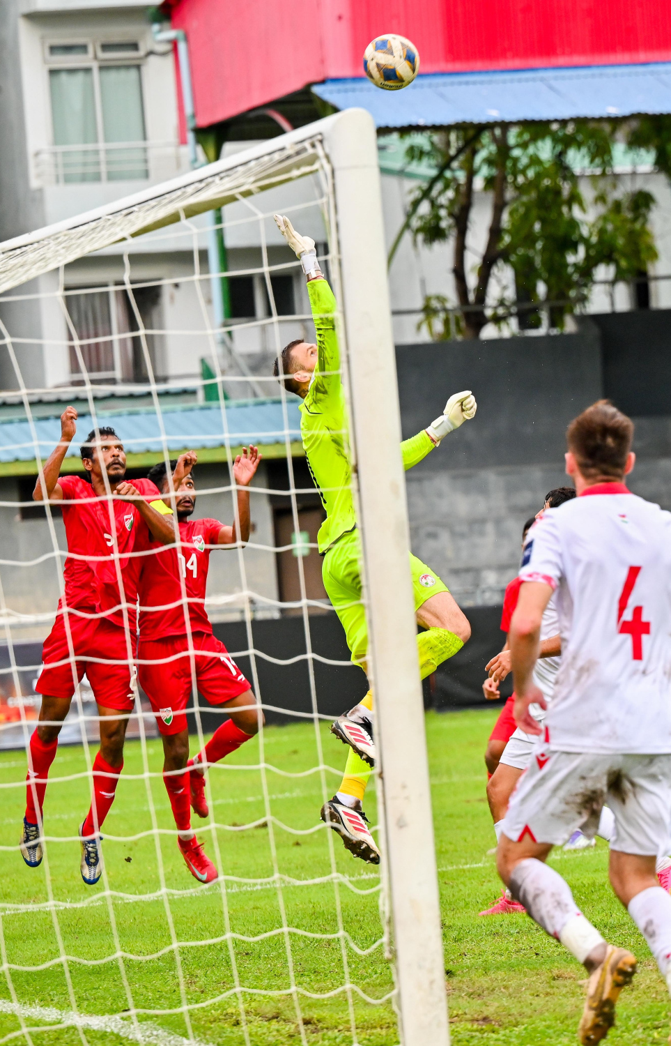 Tajikistan goalkeeper denying Maldives the ball during the second leg match of the Asian Cup qualifiers -- Photo: Fayaz Moosa | Mihaaru
