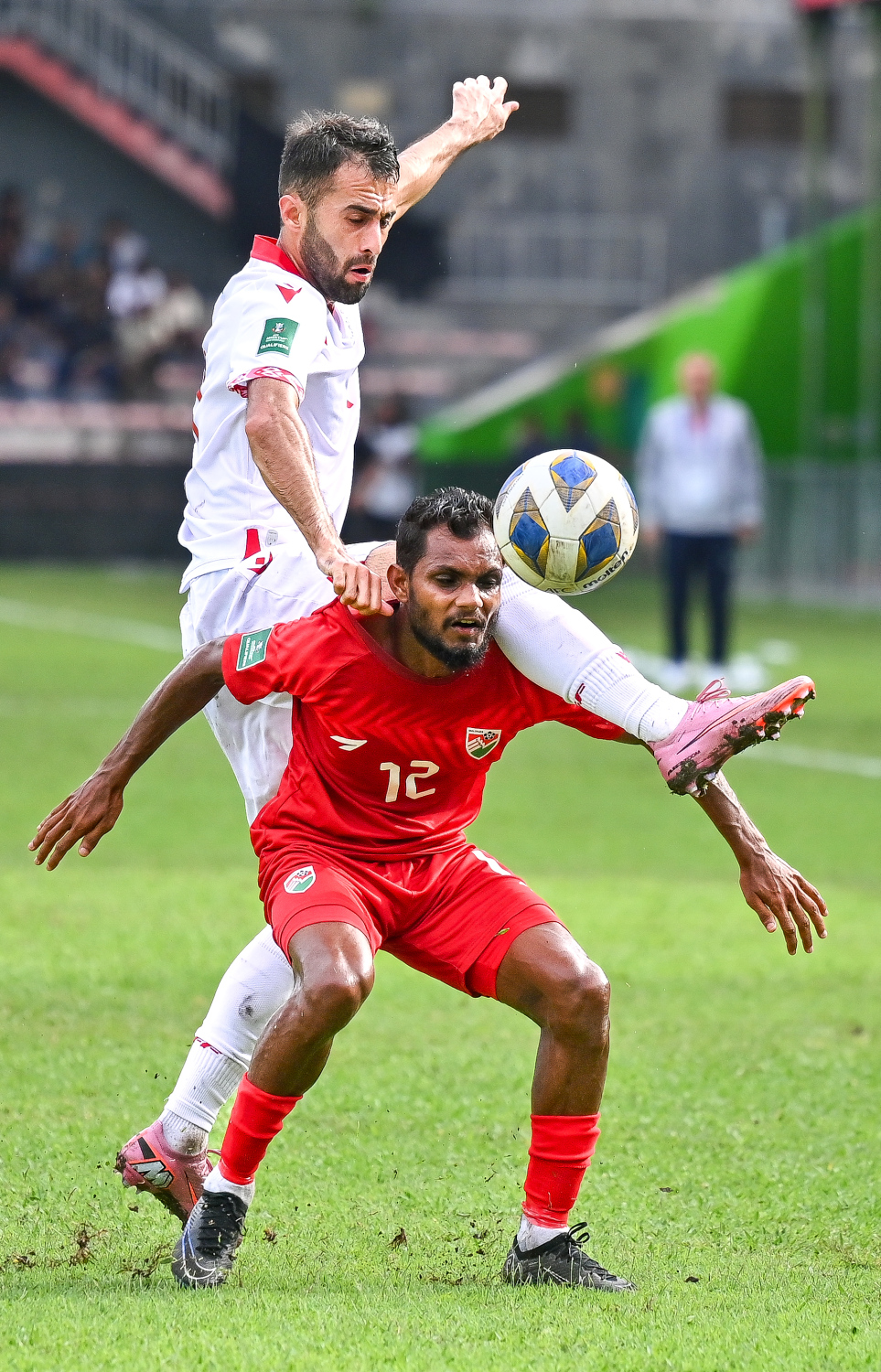 Ibrahim Mahudhee working to move past a Tajikistan player during the Asian Cup qualifiers match -- Photo: Nishan Ali | Mihaaru