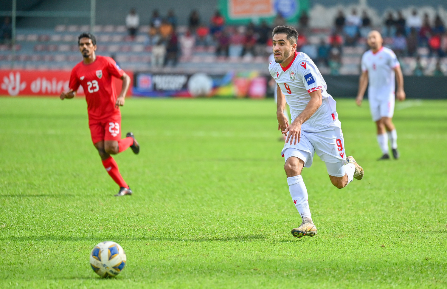 A Tajikistan player moving up the field during the second leg match of the Asian Cup qualifiers -- Photo: Fayaz Moosa | Mihaaru