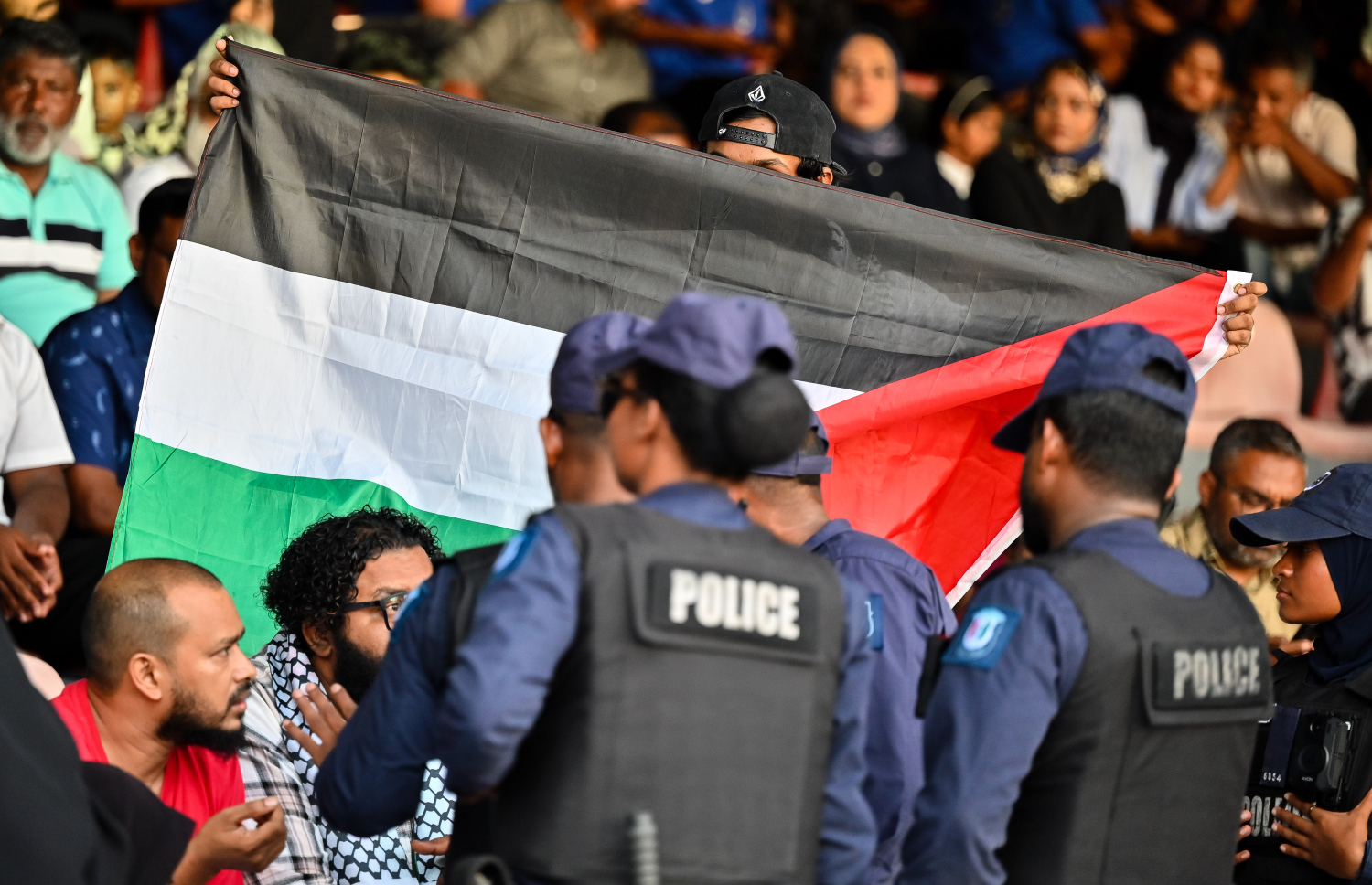 Maldivians at the National Football Stadium protest against the failure to exclude Israel from football activities during the exhibition