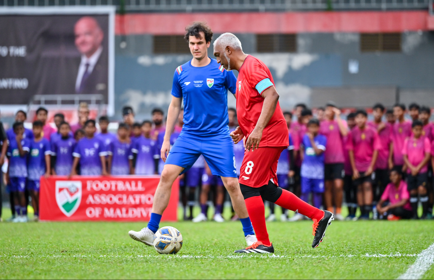President Dr. Muizzu attempts to advance with the ball while FIFA President Gianni Infantino tries to tackle it away. --- Photo: Fayaz Moosa | Mihaaru