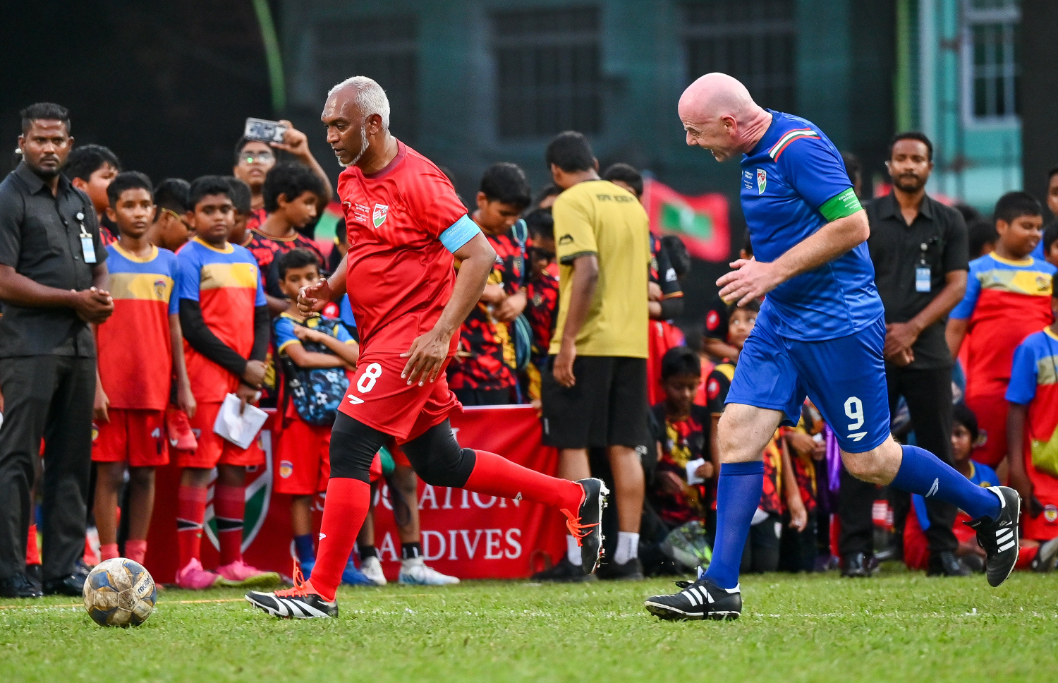 President Muizzu attempts to advance with the ball during the match between President Muizzu's team and Infantino's team. --- Photo: Fayaz Moosa