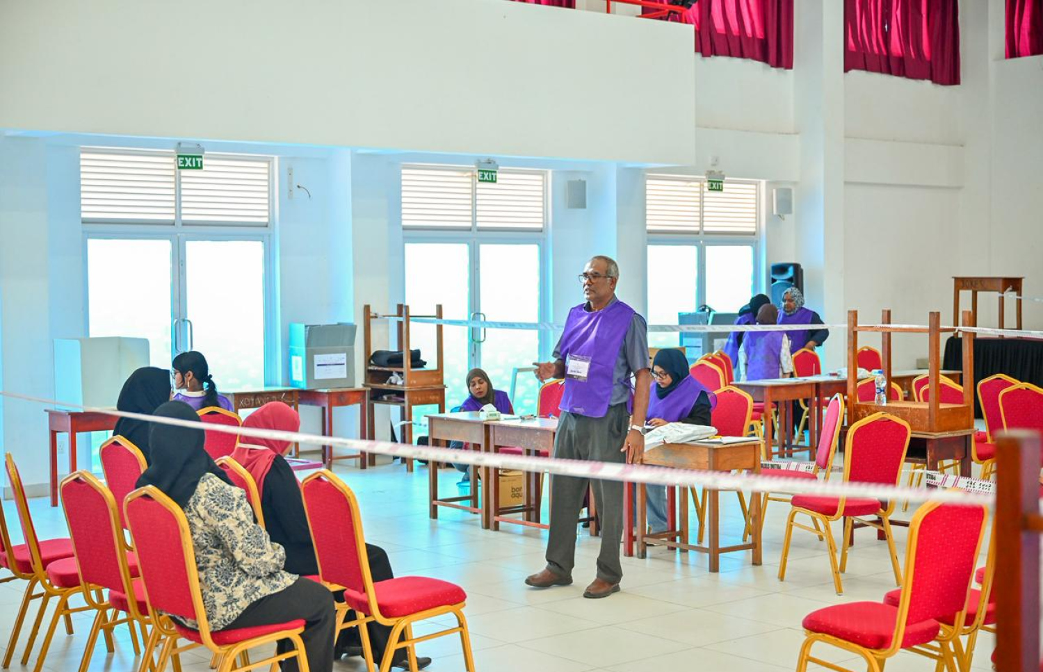 Elections Commission (EC) officials on duty at the polling station established at Feydhoo School. - Photo: Nishan Ali / Mihaaru