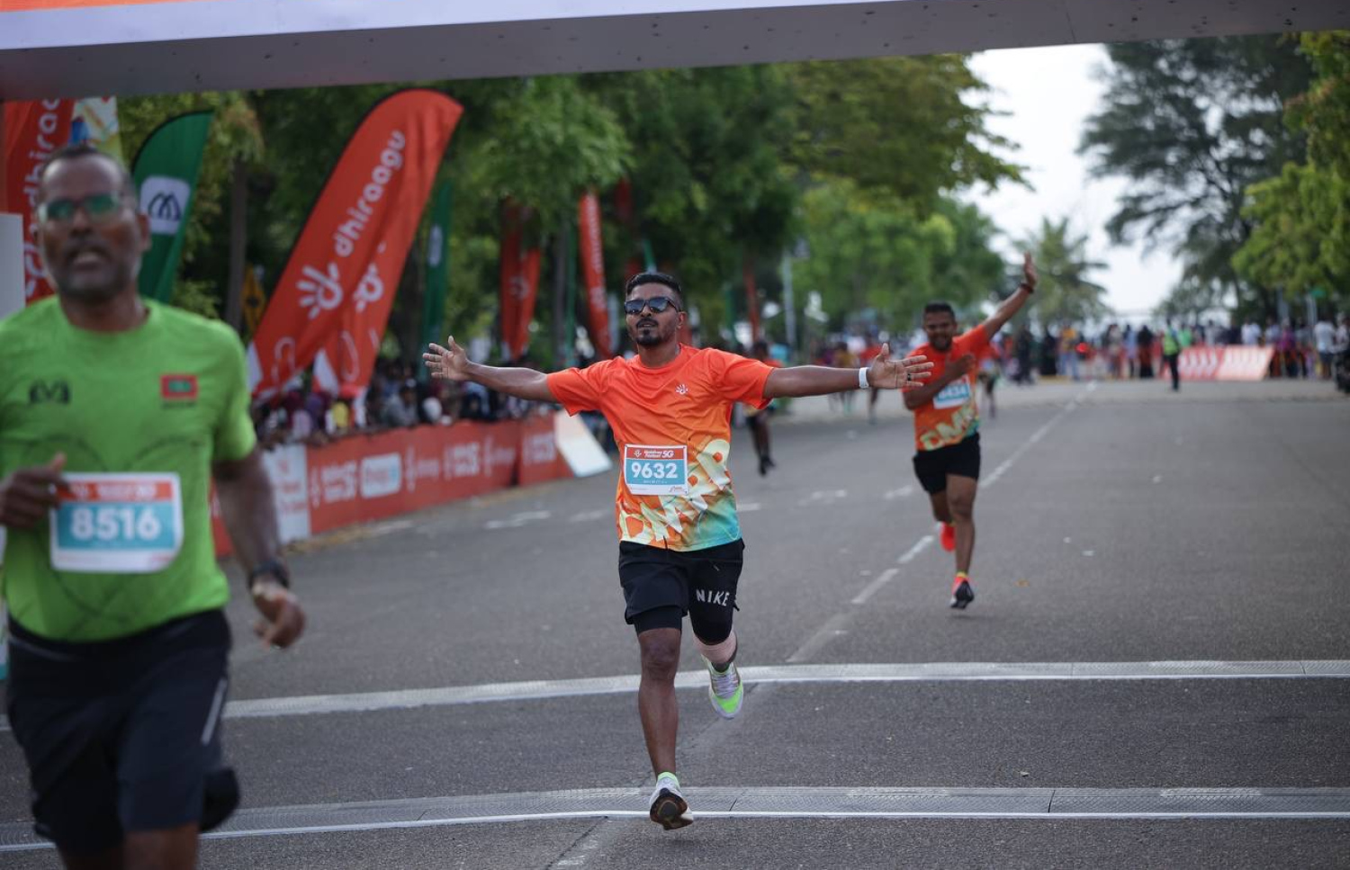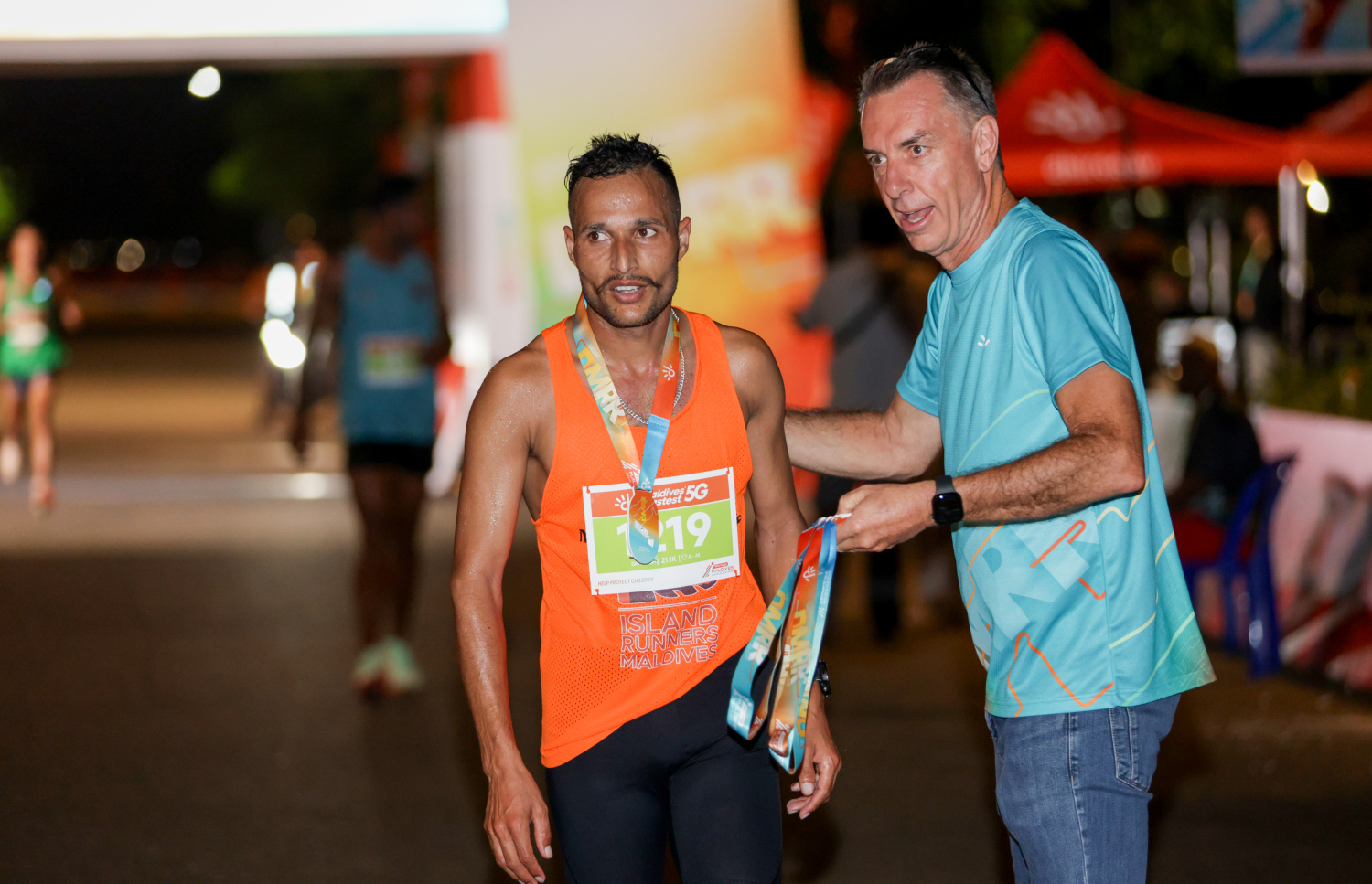 A runner receiving his medal after the 10-kilometer run and crossing the finish line of the Dhiraagu Maldives Road Race -- Photo: Dhiraagu