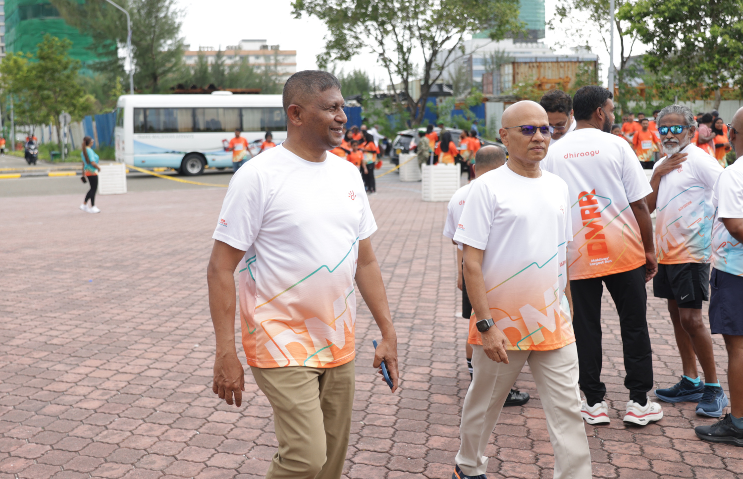 Dhiraagu CEO Ismail Rasheed greeting runners at the DMRR, with Chief of Defense Force Major General Ibrahim Hilmi -- Photo: Dhiraagu