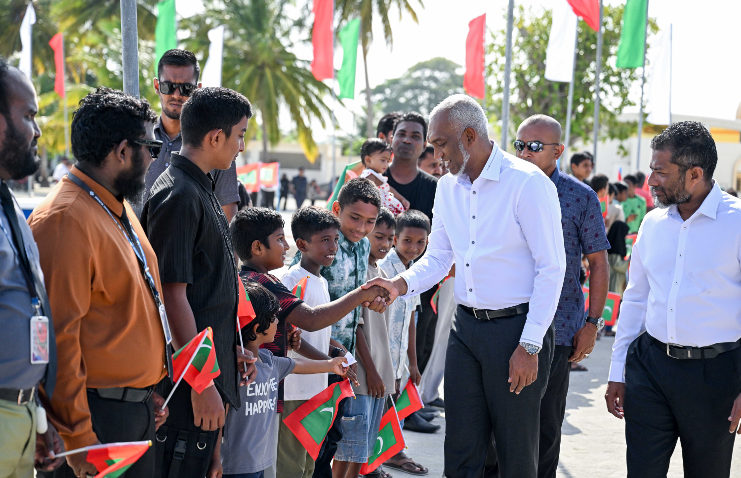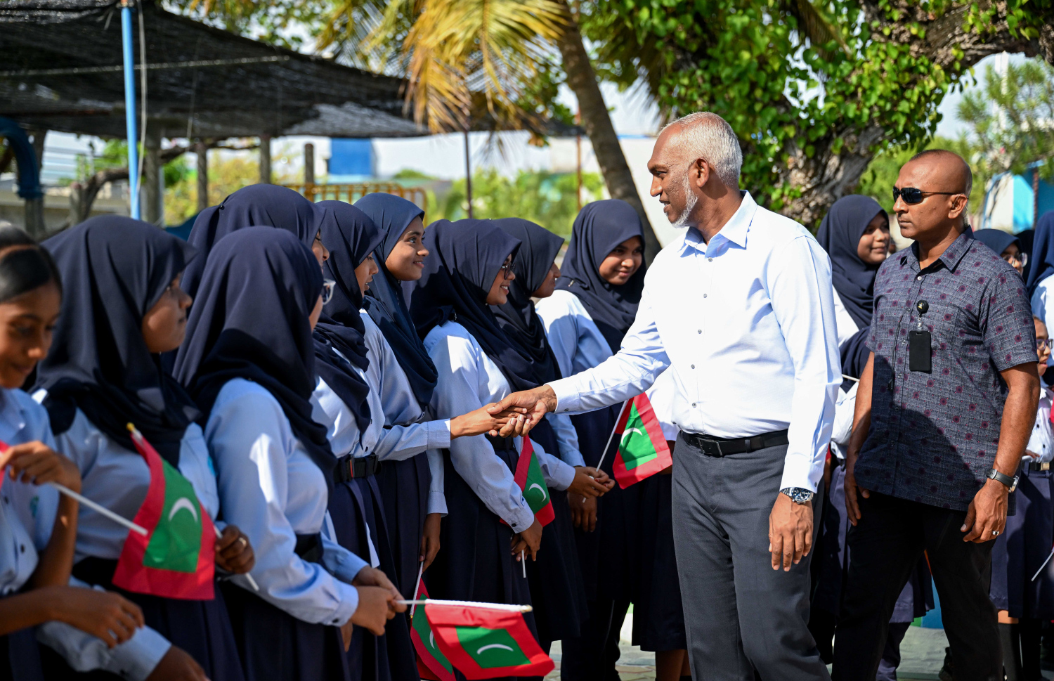 President Muizzu greeting students of Lh. Hinnavaru school upon his arrival -- Photo: President's Office