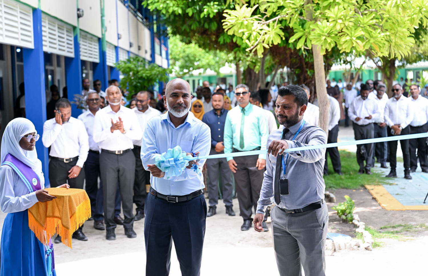 Education Minister Dr. Ismail Shafeeu inaugurating the Lh. Atoll school's multipurpose hall -- Photo: President's Office