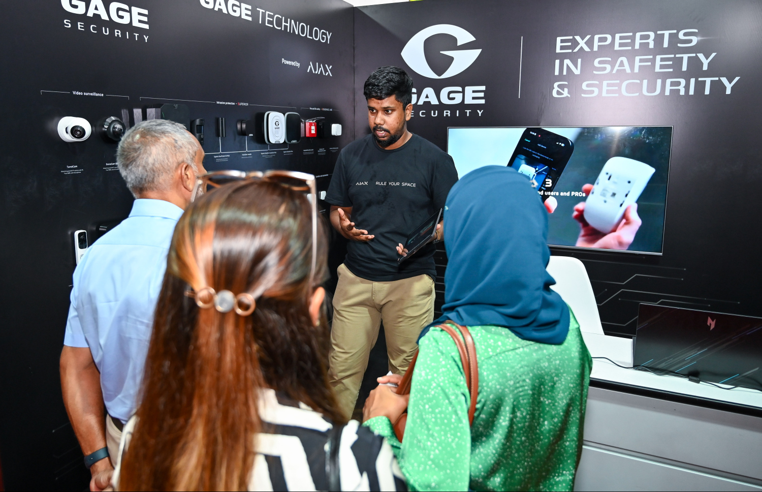 People at a stall at the TechEng 2025 Exhibition being given information on some of their services -- Photo: Fayaz Moosa | Mihaaru